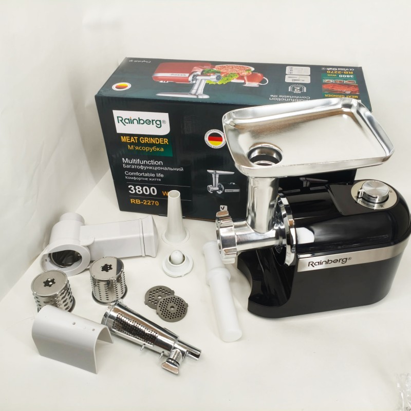 | Назва | М'ясорубка Rainberg RB-2270 з реверсом та насадками для шатківниці та ковбас 3800Вт Black |
