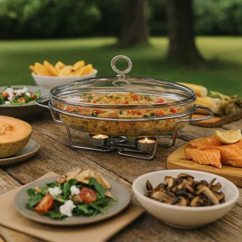 Мармит Magio об’ємом 3 літри — це професійне рішення для подачі та збереження температури гарячих страв. Завдяки овальній формі та жаростійкому склу ви зможете не лише ефектно сервірувати м’ясо, рибу, овочі та гарніри, а й забезпечити їх тривале тепло за столом. Цей мармит поєднує в собі ергономічність і надійність, що робить його незамінним атрибутом як у домашній кухні, так і у сфері кейтерингу та ресторанного бізнесу.