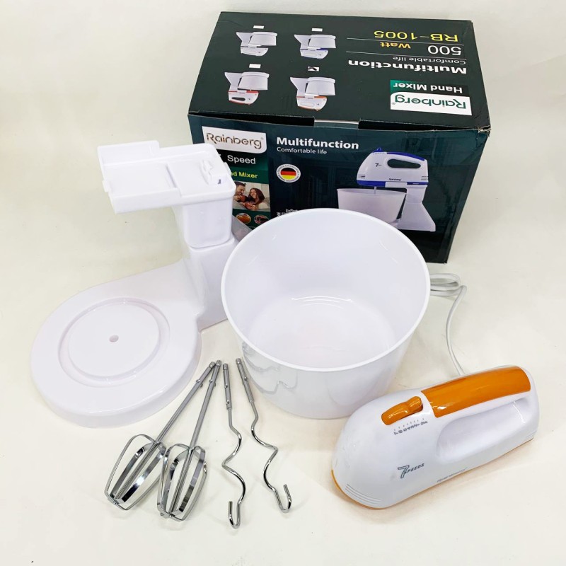 Міксер Rainberg чудовий кухонний помічник. Він оснащений насадками для збивання та перемішування, і відмінно впорається з приготуванням тіста, кремів та коктейлів, соусів та багато іншого. Міксер можна використовувати в ручному режимі та на стаціонарній підставці. Установка 7 швидкостей роботи дозволяє вибирати максимально ефективний для поставленого завдання режим. Корпус міксера виготовлений із пластику, а насадки із нержавіючої сталі. Міксер Rainbergоптимальне співвідношення функціональності та ціни.