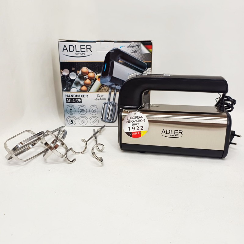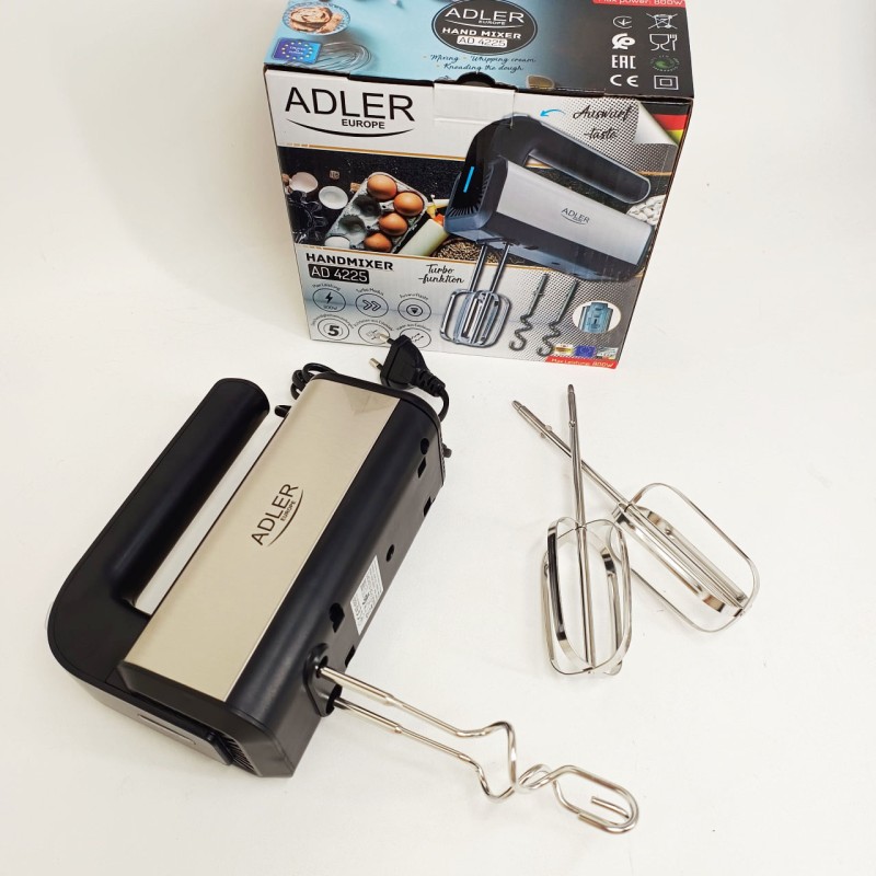 Міксер Adler AD 4225 максимальною потужністю 800 Вт вигідно відрізняється від конкурентів поєднанням прийнятною вартістю з високою функціональністю. Ця модель використовується для збивання та змішування продуктів у домашніх умовах. За допомогою металевих віночків на максимальній швидкості обертання збивають яєчні білки та вершки в густу, ніжну піну, готують різноманітні коктейлі та солодкі молочні десерти. Оберти середньої інтенсивності використовують для поступового збивання кремів для тортів та тістечок, приготування домашніх соусів та майонезів, змішування інгредієнтів для рідкого млинця. Застосування насадки у вигляді спіралі з гачком на кінці та поступового нарощування швидкості обертання допоможуть замісити однорідне, еластичне, густе тісто для пирогів, піци або пельменів.