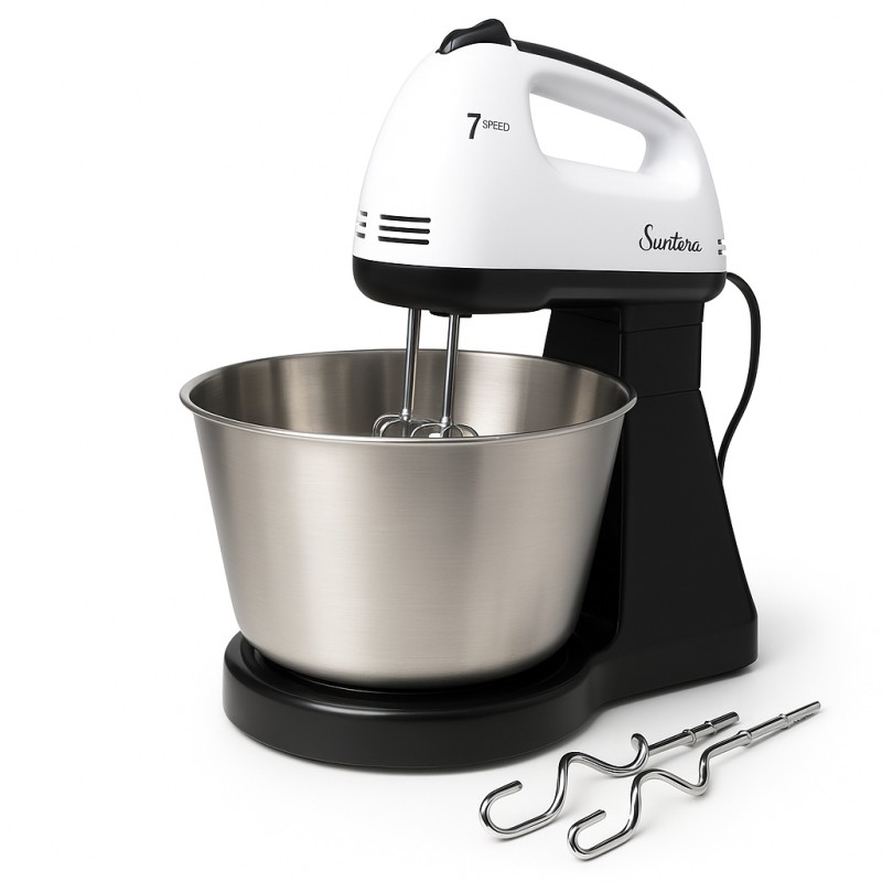 Міксер Suntera ідеально підходить для приготування домашньої випічки – від повітряних бісквітів до щільного хлібного тіста. З його допомогою можна збивати вершки, готувати креми, десерти, салатні заправки та навіть тісто для піци або пирогів. Високий контроль за швидкістю дозволяє уникати розбризкування інгредієнтів та наблизити процес роботи до професійного рівня без необхідності великих фінансових вкладень. Завдяки мережевому живленню міксер завжди готовий до використання без обмежень по часу, що особливо важливо для тривалих кулінарних сесій.