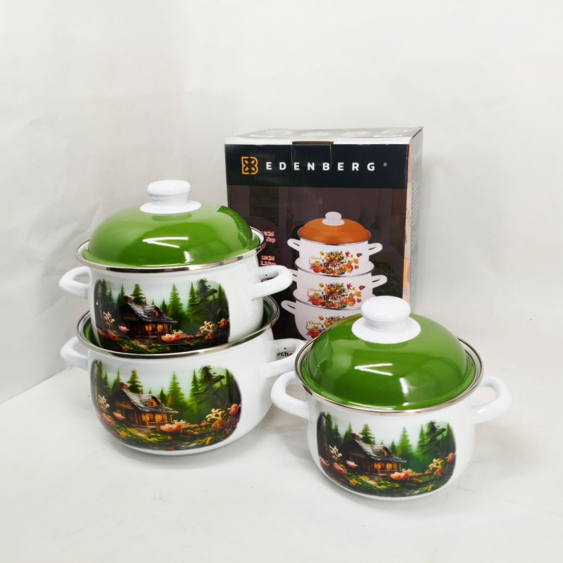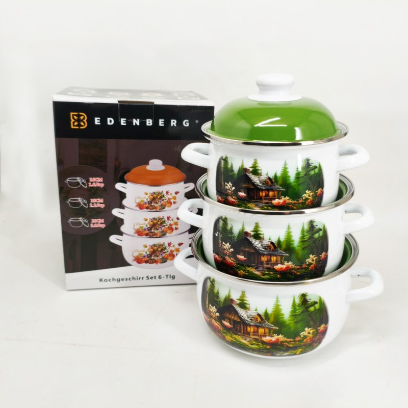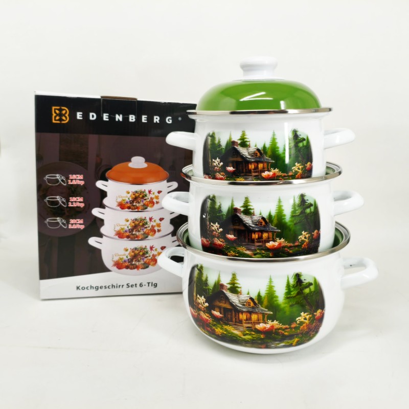 Каструлі виконані з міцної емальованої сталі, стійкої до подряпин та впливу високих температур. Емальоване покриття забезпечує рівномірний розподіл тепла, запобігаючи пригоранню страв. Зовнішня поверхня каструль оформлена в білому кольорі із зображенням затишного будиночка в лісі, оточеного квітами та деревами, що надає посуду особливого сільського шарму. Кришки виконані у насиченому зеленому кольорі та оснащені зручними ручками. Ергономічні бічні ручки забезпечують надійний хват і комфорт під час експлуатації.