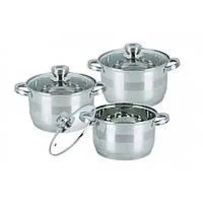 Даний набір порадує будь-якого кухаря чи домогосподарку своєю практичністю та зручним використанням. У ньому Ви знайдете: три каструлі великі та кришки до них. Це великий та якісний набір, виготовлений із екологічно чистої нержавіючої сталі. Посуд оснащений скляними кришками. Капсульне, індукційне дно швидко прогрівається та рівномірно розподіляє тепло. Після використання Ви зможете помити каструлі та інші вироби з набору самостійно або відправити у посудомийну машину.