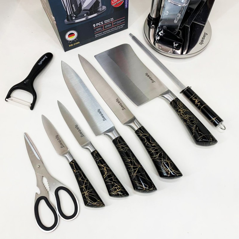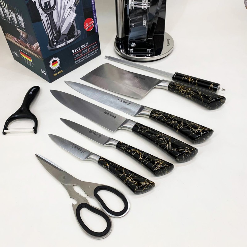 Компактна обертова підставка не тільки додає естетики до кухонного простору, а й дозволяє зручно зберігати всі елементи набору під рукою. Rainberg RB-2499 стане ідеальним помічником як для повсякденного приготування, так і для кулінарних експериментів.