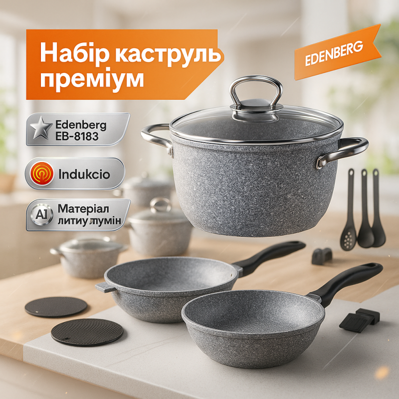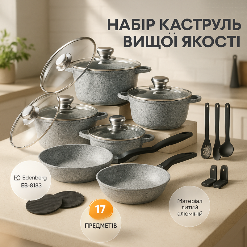 | Назва | Набір кухонного посуду Edenberg EB-8183 із гранітним антипригарним покриттям 17 предметів |