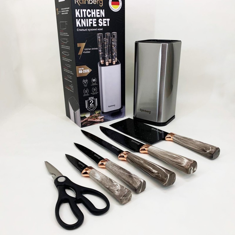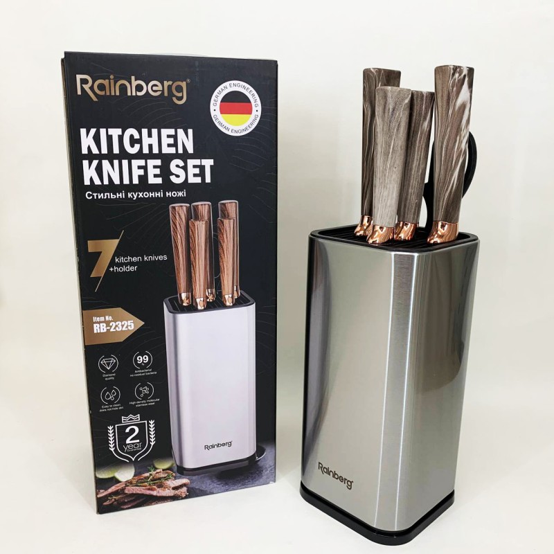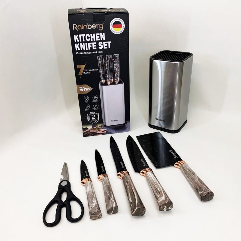 Леза з нержавіючої сталі вкриті декоративним чорним покриттям із білими крапками, що підкреслює преміальність набору. Підставка дозволяє зберігати всі елементи в одному місці, забезпечуючи порядок і зручний доступ. Rainberg RB-2325 стане чудовим помічником у приготуванні страв і водночас прикрасить кухонний простір.
