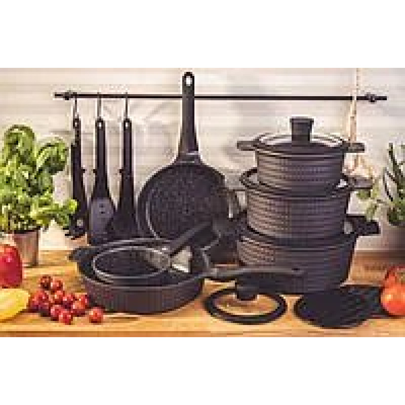Набір посуду з тришаровим мармуровим покриттям Edenberg EB-5645 складається з 17 предметів – три каструлі, ківш, 2 сковороди, дві підставки, дві прихватки та кухонні аксесуари у вигляді кухаря, ложки та лотпатки. Скляні загартовані кришки з паровідведенням. На кришках обідок із нержавіючої сталі. Весь посуд виготовлений з високоякісного литого алюмінію, 3-х мармурове антипригарне покриття забезпечуючи міцність посуду. Служить довго, не боїться механічних впливів, стійкіший до пошкоджень і подряпин, у тому числі перевершує за характеристиками навіть керамічні покриття. Посуд можна мити в посудомийній машині. Всі елементи набору посуду при правильній експлуатації прослужать довго і не потемніють, не піддаються корозії та потьмянінню. Комплектація набору посуду Edenberg EB-5645: Ківш з кришкою – 1.3л, діаметр 16см, Сковорода – 1,9л, діаметр 24см, Сковорода – 3,6л, діаметр 28см, Каструля з кришкою – 1.9л, діаметр 20см, Каструля кришкою – 4.3л, діаметр 24 см, Каструля з кришкою – 6.4л, діаметр 28 см, Підставки під гаряче – 2шт, Силіконові прихвати – 2шт, Кухонні аксесуари з нейлону – 3шт: Лопатка, Вилка для спагетті, Половник