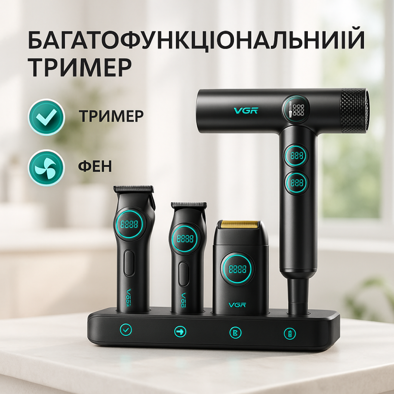 | Назва | Набір VGR STEPLERSS RPO 4 IN 1 BLACK, триммер, машинка для стрижки, електробритва, фен |