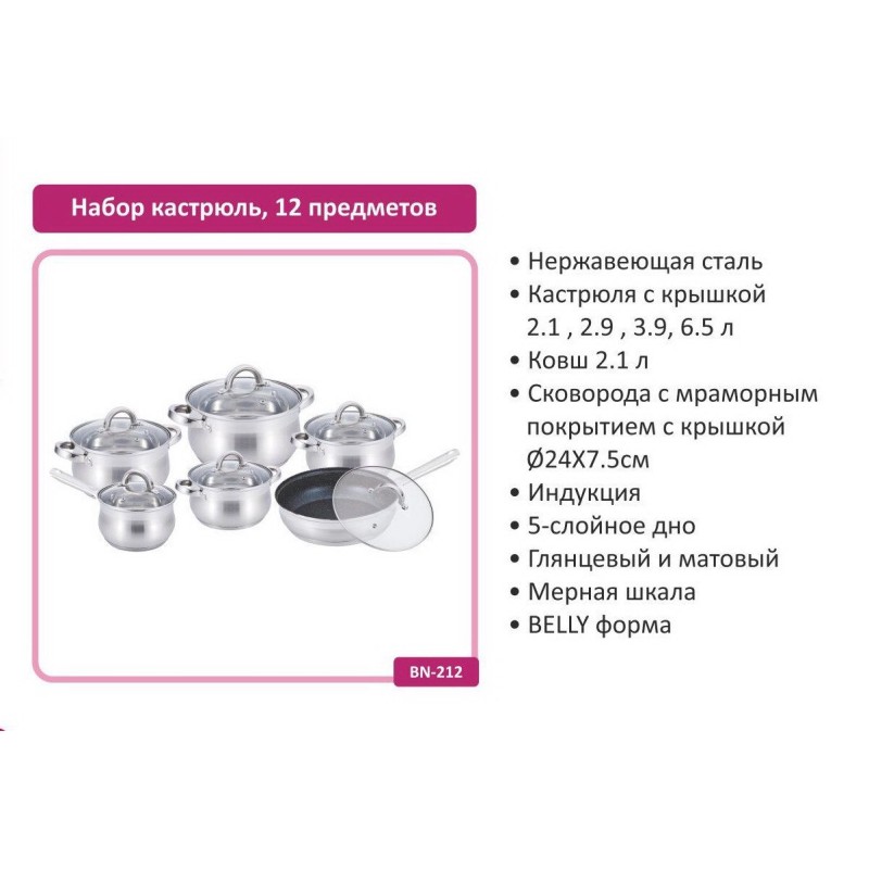 Набор кастрюль BN-212 (12 предметов) Практичный и стильный набор посуды из нержавеющей стали станет отличным решением для ежедневного приготовления. Подходит для всех типов плит, включая индукционные. Комплектация: Кастрюли с крышками: 2.1 можна замовити в інтернет-магазині Shtyrman. Перевіряйте модель, виробника, наявність і характеристики перед покупкою.