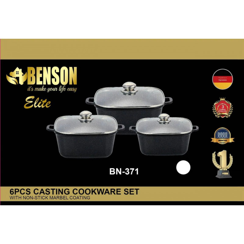 Набор кастрюль с мраморным покрытием 6 предметов BN-371 — для приготування супів, каш, тушкованих страв та варіння на весь сімейний стіл. Якісна нержавіюча сталь або антипригарне покриття забезпечують гігієнічність та довговічність. Скляна кришка дозволяє стежити за процесом приготування без відкривання. Зручні ручки-прихватки не нагріваються. Підходить для всіх видів плит включно з індукційними.