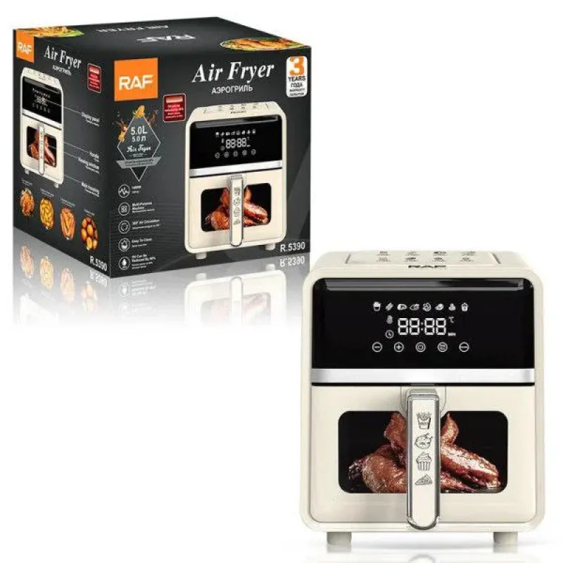 Аэро-Фритюрница RAF 5390, 5л, 1400вт — готуйте смачно та корисно для всієї родини! Технологія циркуляції гарячого повітря дозволяє смажити, запікати та готувати гриль практично без олії. Програмований таймер та регулювання температури забезпечують точний контроль приготування. Антипригарне покриття кошика легко миється. Заощаджує час і зберігає поживні речовини в їжі.