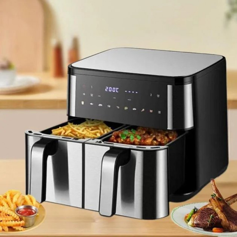 Аерофритниця сенсорна 12л ZP-209 безмасляний аерогриль для дому з таймером та 2 знімними чашами 4000W — готуйте смачно та корисно для всієї родини! Технологія циркуляції гарячого повітря дозволяє смажити, запікати та готувати гриль практично без олії. Програмований таймер та регулювання температури забезпечують точний контроль приготування. Антипригарне покриття кошика легко миється. Заощаджує час і зберігає поживні речовини в їжі.