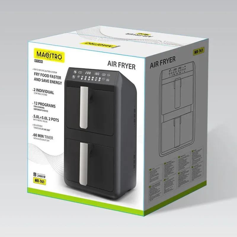 З аерофритюрницею MR-761 ви зможете готувати широкий асортимент страв: від хрусткої картоплі фрі та соковитих курячих крильців до овочевих чіпсів та випічки. Технологія циркуляції повітря забезпечує рівномірне пропікання з усіх боків, створюючи апетитну скоринку без використання великої кількості жиру. Це не лише смачно, але й корисно для вашого здоров'я та фігури.