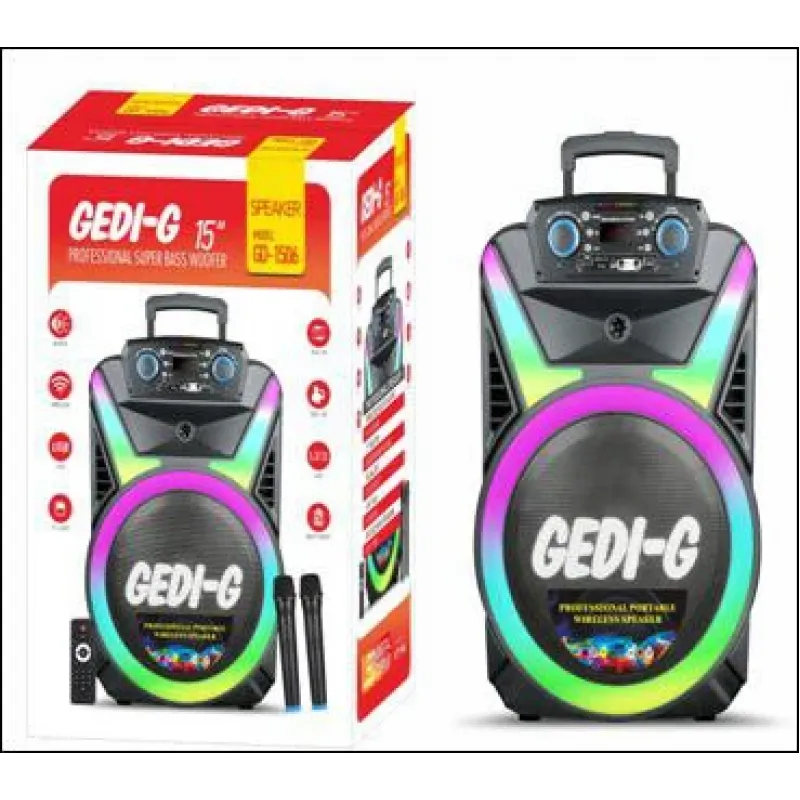 Аккумуляторная блютуз колонка 15″ GD-1506 — насичений та потужний звук у компактному корпусі. Бездротова технологія Bluetooth забезпечує якісне підключення з будь-якого пристрою. Водонепроникний корпус IPX5 дозволяє використовувати колонку на вулиці та у ванній. Вбудований акумулятор забезпечує до 8-12 годин безперервної роботи. Вбудований мікрофон для гучного зв'язку.