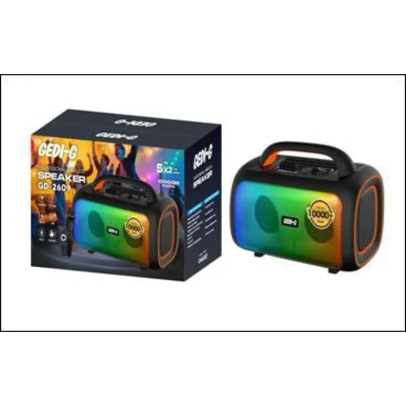 Аккумуляторная блютуз колонка 2 микрофона 2*5″ GD-2609 — насичений та потужний звук у компактному корпусі. Бездротова технологія Bluetooth забезпечує якісне підключення з будь-якого пристрою. Водонепроникний корпус IPX5 дозволяє використовувати колонку на вулиці та у ванній. Вбудований акумулятор забезпечує до 8-12 годин безперервної роботи. Вбудований мікрофон для гучного зв'язку.
