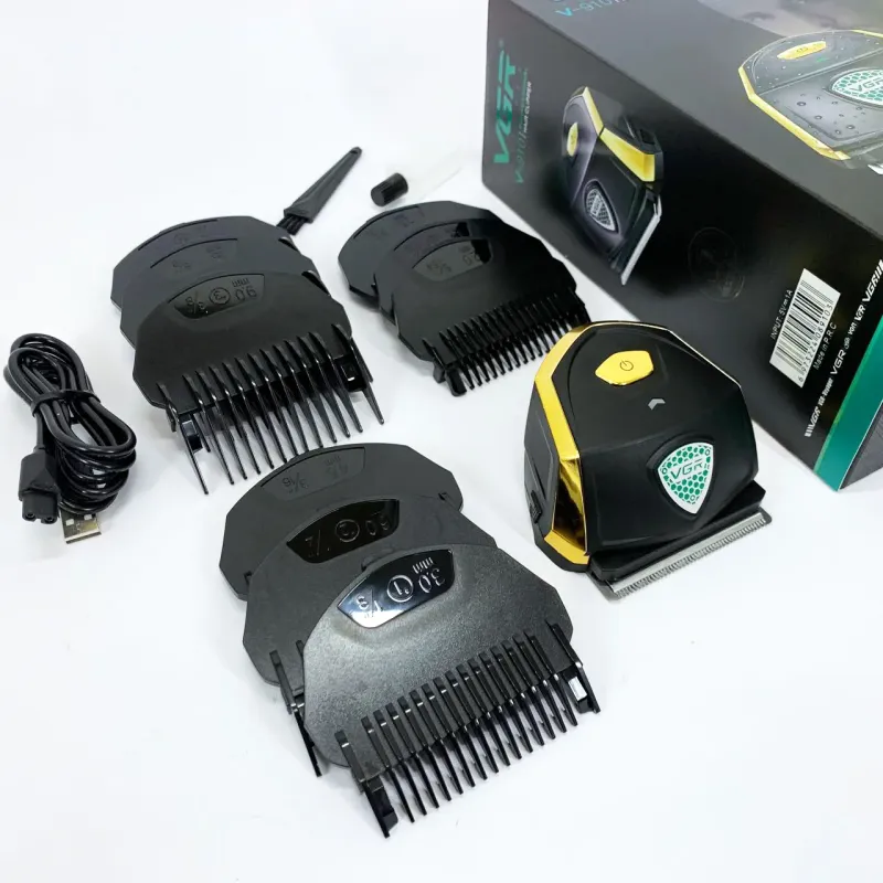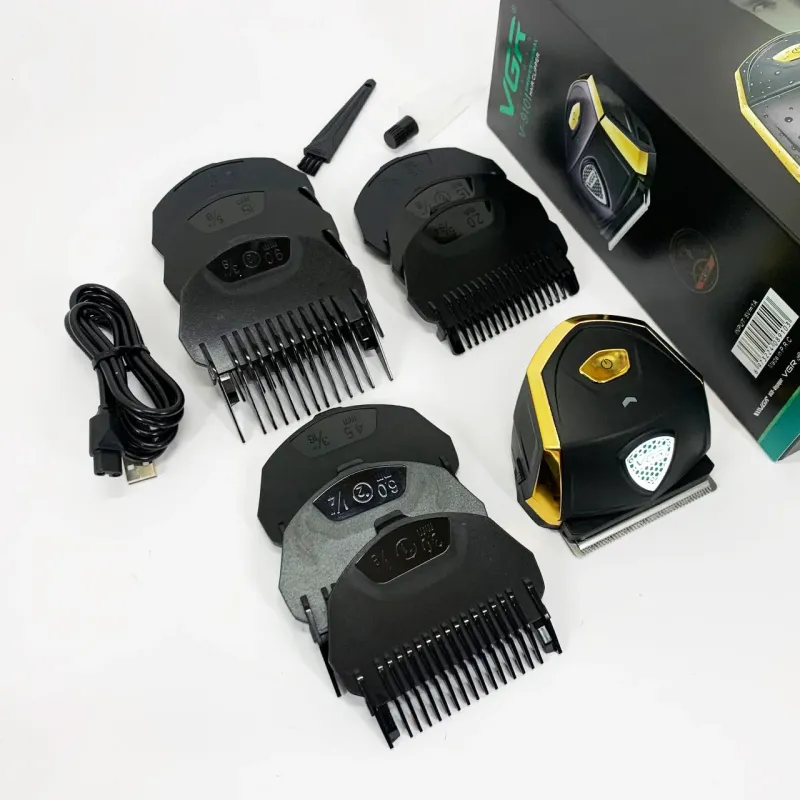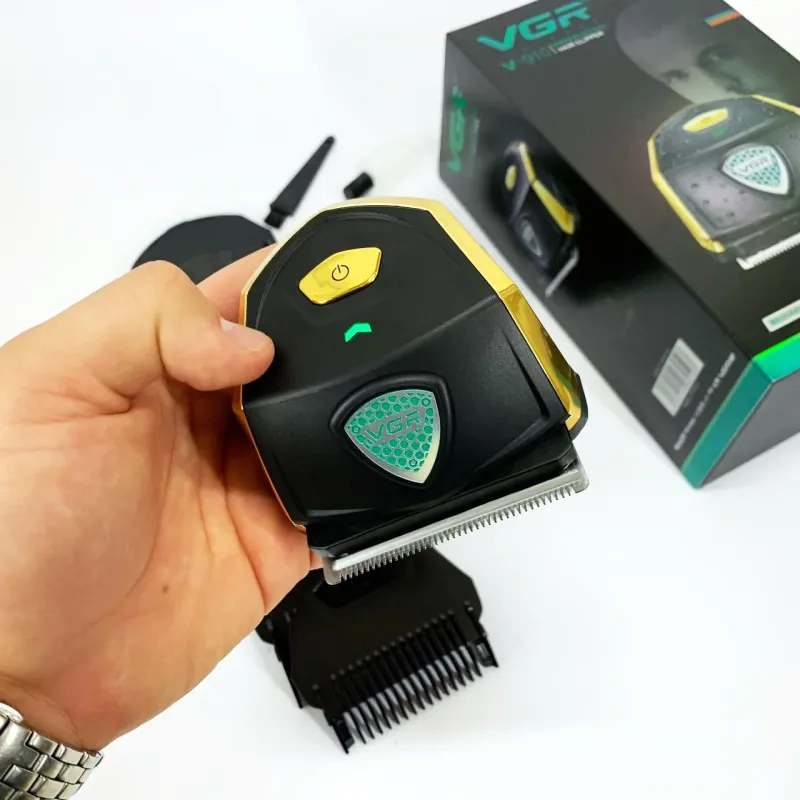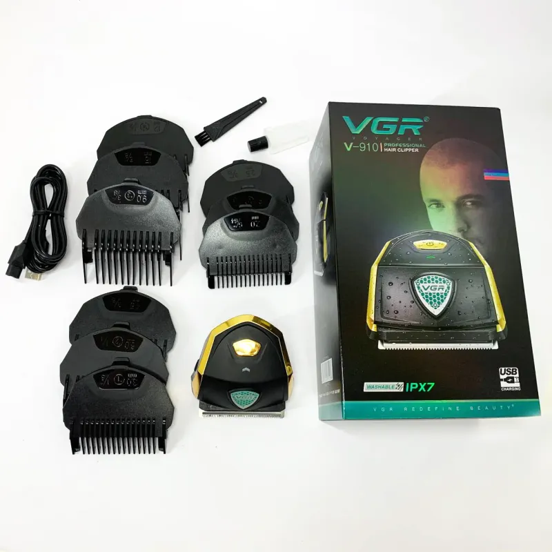 Мощный и стильный аккумуляторный триммер VGR V-910 с 9 насадками, LED-дисплеем и защитой от воды IPX7. Идеален для стрижки волос, бороды и усов в домашних условиях.