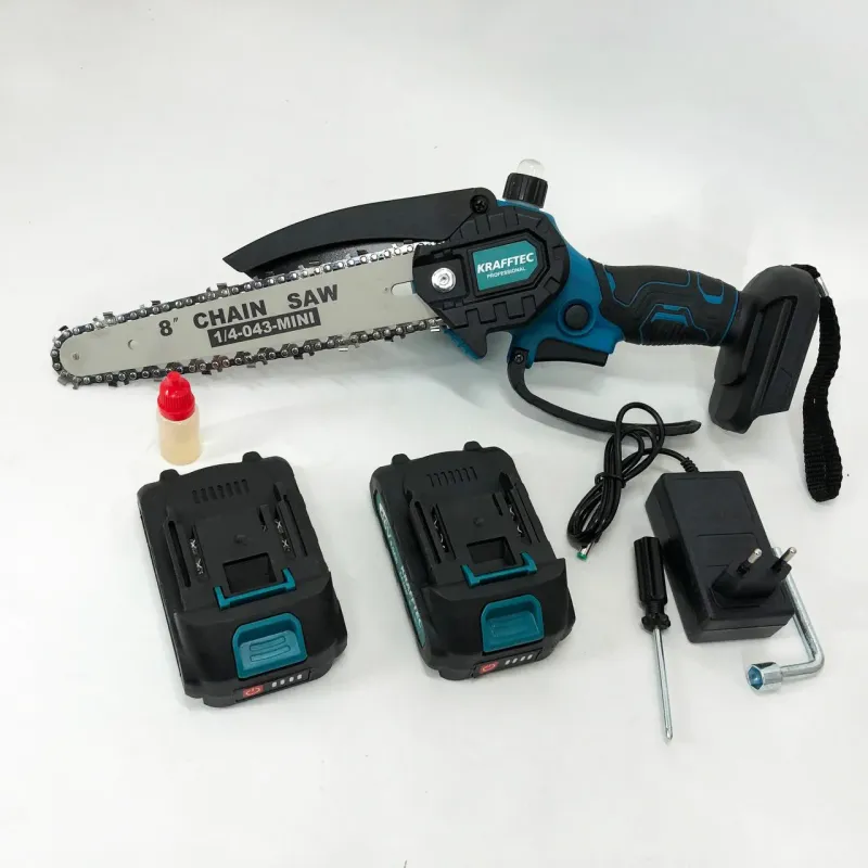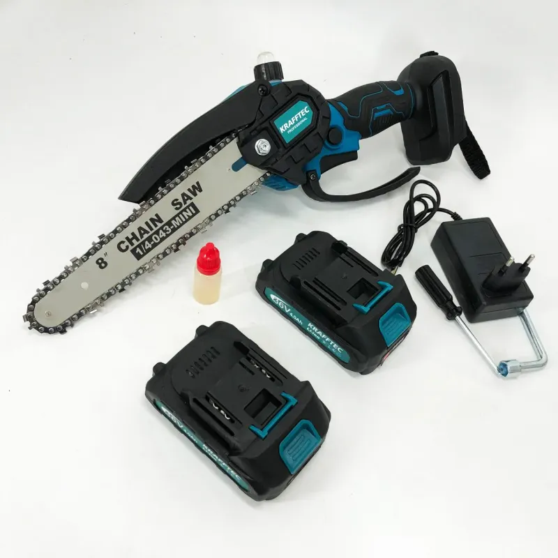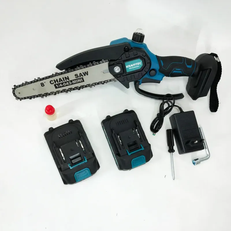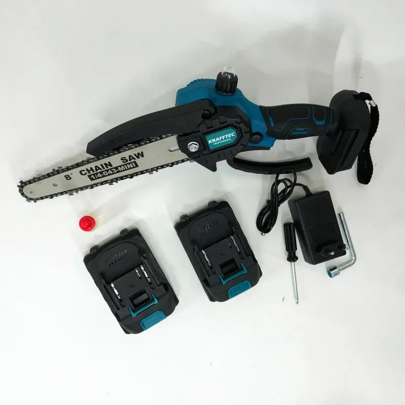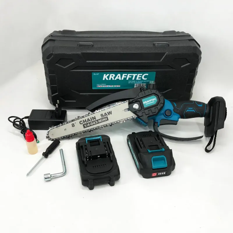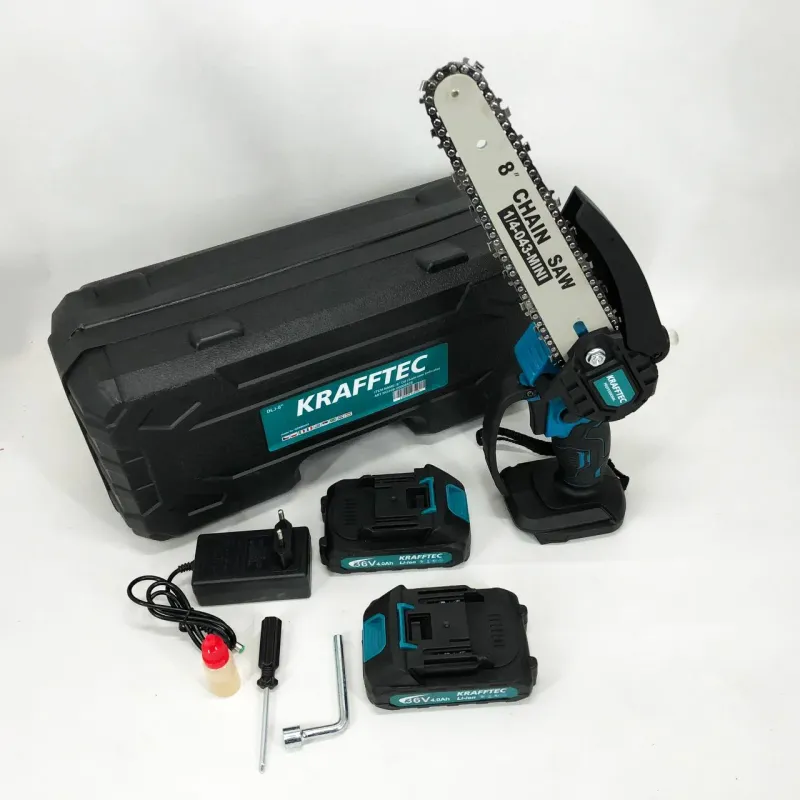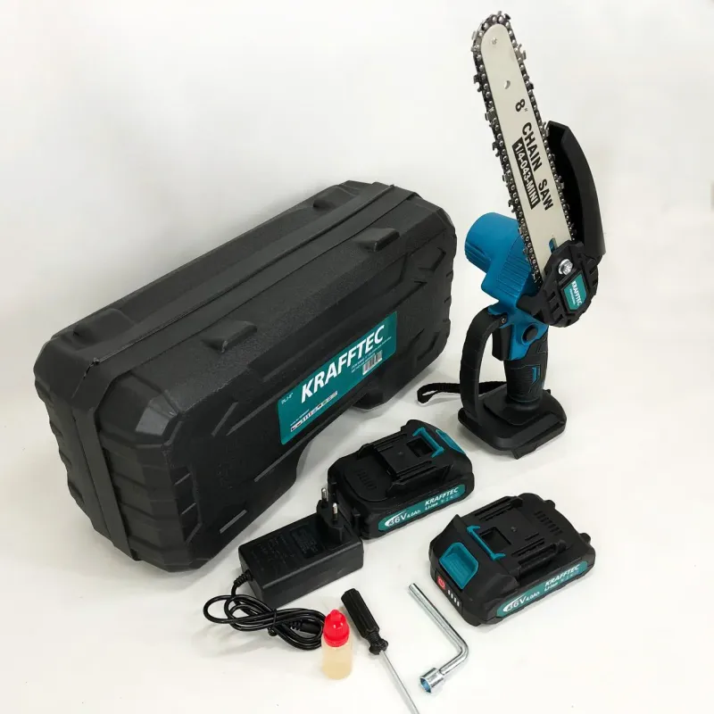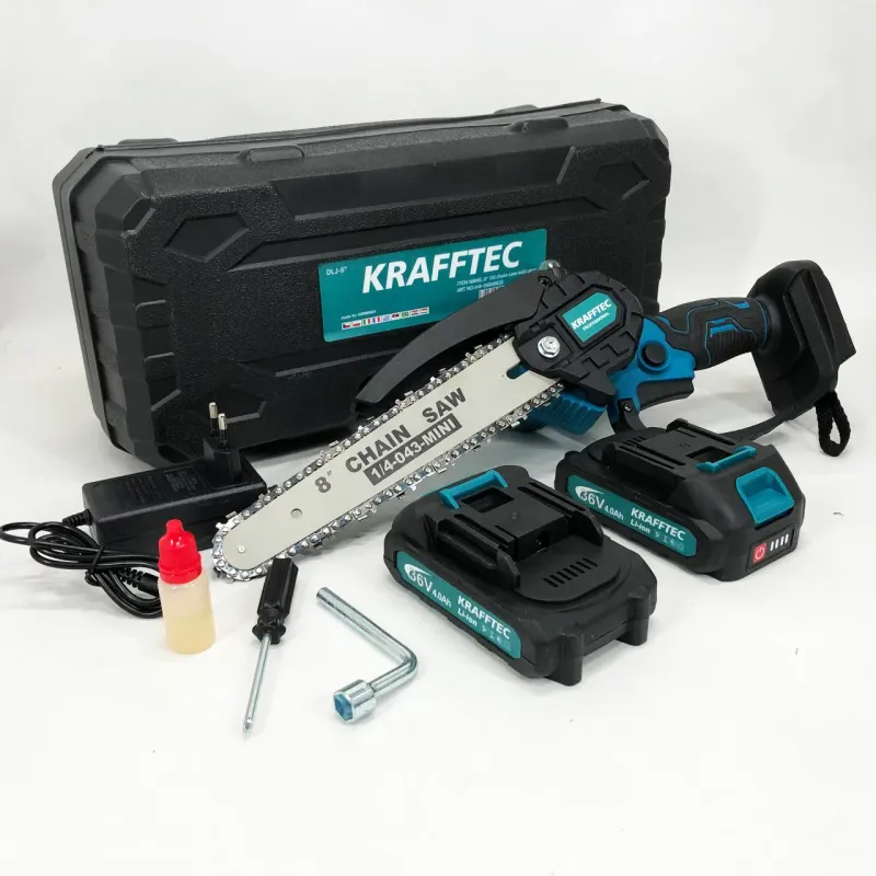 Аккумуляторная цепная мини пила в кейсе Krafftec – это универсальный веткорез для обрезки деревьев и кустарников, для рубки и измельчения садовых отходов и для небольшого строительства из дерева.