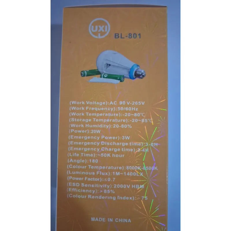 Led-лампочка Е27 з вбудованим акумулятором, три режими освітлення, заряджається, коли світло є, і працює від акумулятора, коли світла немає до 2 годин. Тип акумулятора: Батарея 18650 на 1500 mAh Потужність: 12W Led (65 ват) Ресурс роботи 8000 годин. 6500К Якщо лампочку вкрутити в люстру, вона працює як звичайна лампочка, поки є світло, вмикається, вимикається через вимикач, але коли світло пропадає, то вона продовжує світити, коли світло відновлюється, то вона працює знову від електроенергії та заряджається. До повного заряду потрібно 4-6 годин лампочки, що працює в цоколі, це важливо розуміти, лампочка заряджається тільки коли увімкнена, якщо вона просто вкручується в патрон і не увімкнена — не заряджається. Тому потрібно заздалегідь розуміти, коли можуть світло вимкнути та заряджати поки світло є. Також лампочку можна перевірити, що працює прямо на полиці, для цього потрібно один палець поставити зверху на цоколь, а інший збоку, у такий спосіб контакти замикаються і лампочка вмикається від вбудованого акумулятора. А вдома, щоб перевірити, потрібно вкрутити в цоколь, увімкнути й піти вимкнути на щитку автомати, лампочка продовжить працювати.
