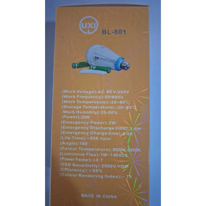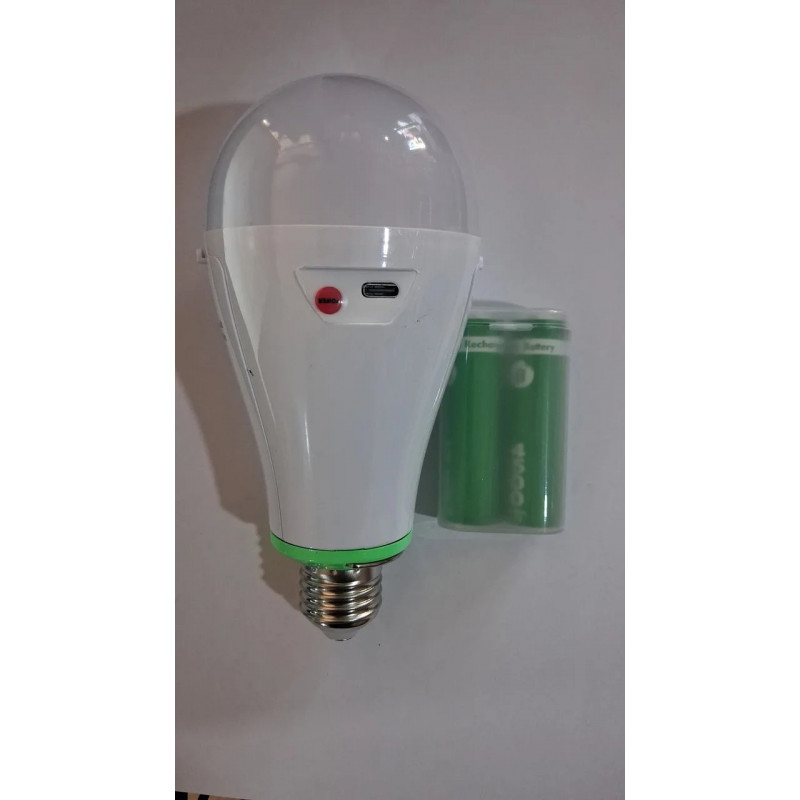 Led-лампочка Е27 з вбудованим акумулятором, три режими освітлення, заряджається, коли світло є, і працює від акумулятора, коли світла немає до 2 годин. Тип акумулятора: Батарея 18650 на 1500 mAh Потужність: 12W Led (65 ват) Ресурс роботи 8000 годин. 6500К Якщо лампочку вкрутити в люстру, вона працює як звичайна лампочка, поки є світло, вмикається, вимикається через вимикач, але коли світло пропадає, то вона продовжує світити, коли світло відновлюється, то вона працює знову від електроенергії та заряджається. До повного заряду потрібно 4-6 годин лампочки, що працює в цоколі, це важливо розуміти, лампочка заряджається тільки коли увімкнена, якщо вона просто вкручується в патрон і не увімкнена — не заряджається. Тому потрібно заздалегідь розуміти, коли можуть світло вимкнути та заряджати поки світло є. Також лампочку можна перевірити, що працює прямо на полиці, для цього потрібно один палець поставити зверху на цоколь, а інший збоку, у такий спосіб контакти замикаються і лампочка вмикається від вбудованого акумулятора. А вдома, щоб перевірити, потрібно вкрутити в цоколь, увімкнути й піти вимкнути на щитку автомати, лампочка продовжить працювати.