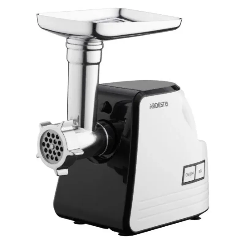 ARDESTO Мясорубка, 2300Вт, призв. -2.2кг/мин, 4 решетки + для колбас., кеббе, насадка для томатов, пластик, бело-черный — незамінний помічник на кухні для приготування фаршу, котлет, ковбасок та паштетів. Потужний двигун легко справляється з будь-яким видом м'яса та рибою. Комплект насадок розширює можливості приготування. Металевий корпус шнека та ножів забезпечує довговічність і гігієнічність. Легко розбирається для чищення.