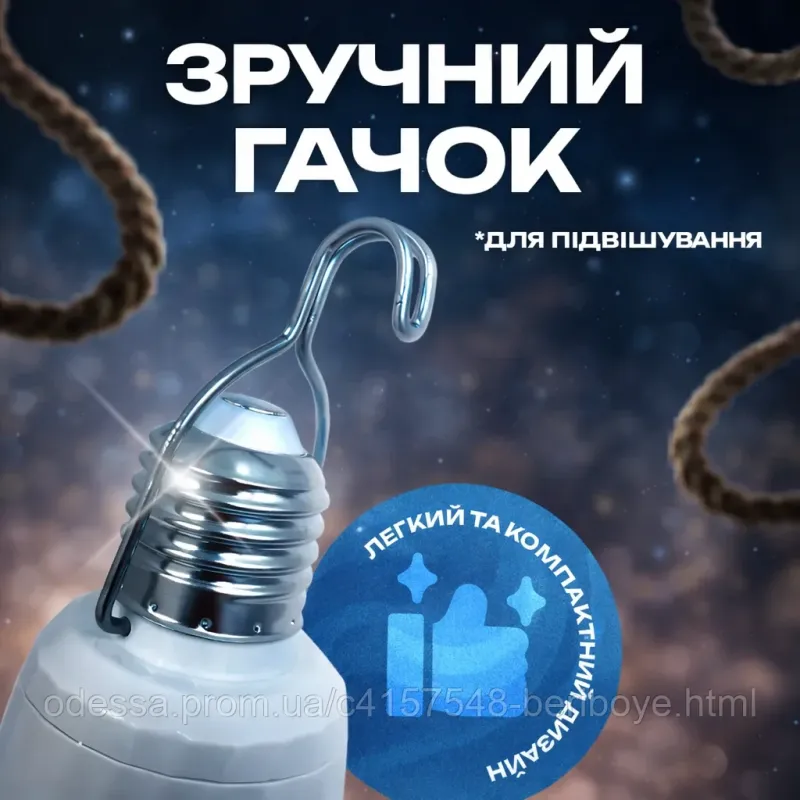 Вкрутіть лампу в звичайний патрон E27 — вона автоматично заряджатиметься від мережі. При відключенні електрики лампа миттєво перемикається на акумулятор. Для переносного використання викрутіть лампу та підвісьте за гачок у потрібному місці.