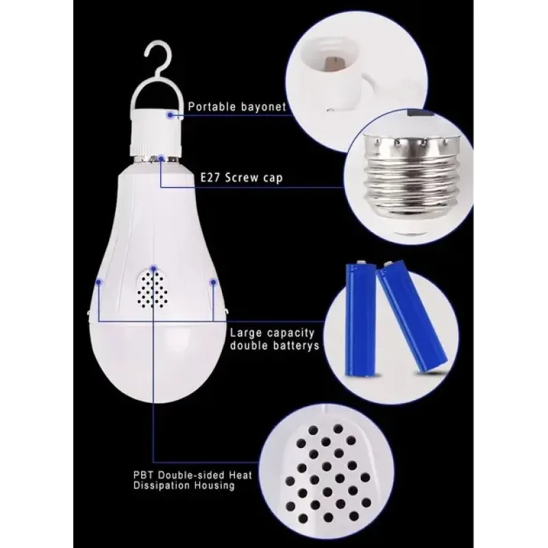 Лампочка вкручується в звичайний патрон E27 і працює як стандартна LED-лампа. При відключенні електрики автоматично перемикається на акумулятор, забезпечуючи до 6 годин безперервного світла. Можна використовувати як підвісний ліхтар для кемпінгу або аварійне освітлення.