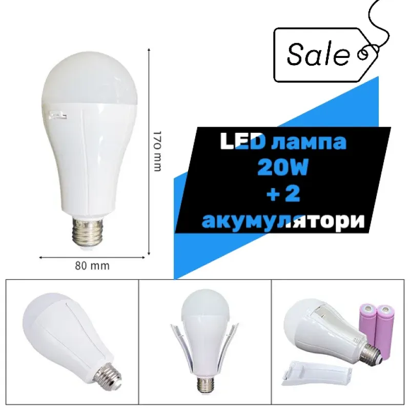 Теги: аварійний світильник, LED лампа на акумуляторі, освітлення для гаража, резервне освітлення, світильник для дому, автономна лампа, світлодіодна лампа
