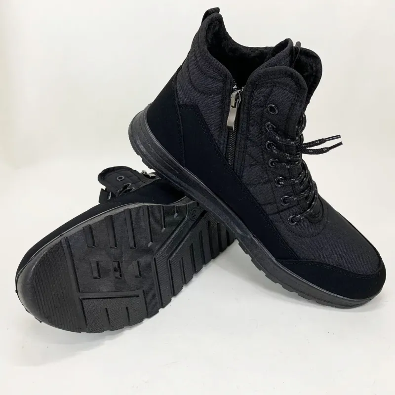 Мужские утепленные ботинки — это функциональная зимняя обувь, которая сочетает современный вид с высокой износостойкостью и комфортом. Верх модели изготовлен из прочного текстиля с водоотталкивающими свойствами, усиленного вставками из искусственной замши. Высокий силуэт и классическая шнуровка придают обуви надежную фиксацию, что особенно важно в прохладное время года.