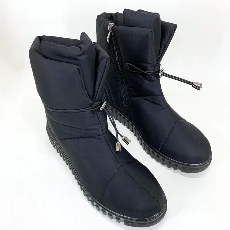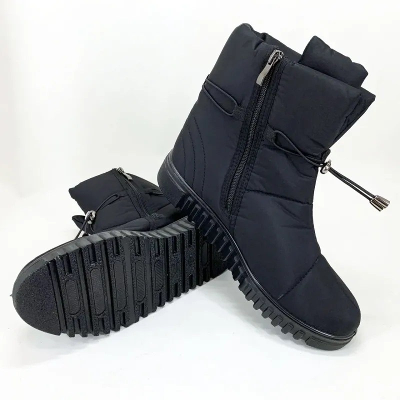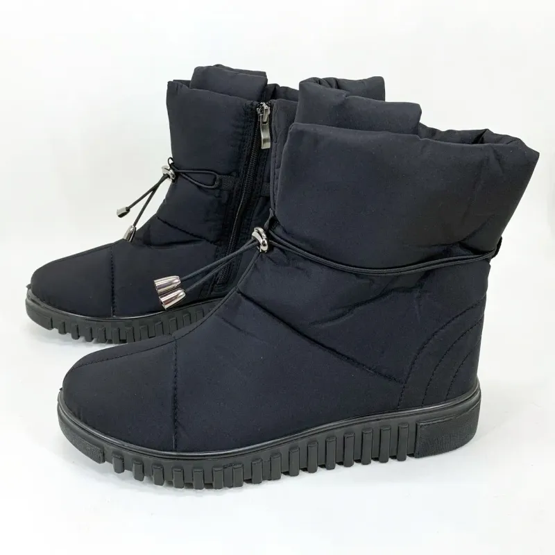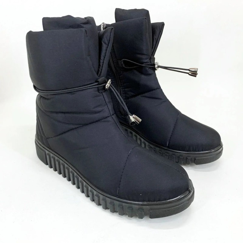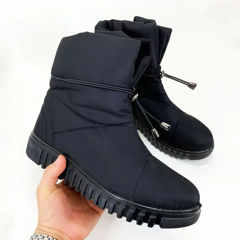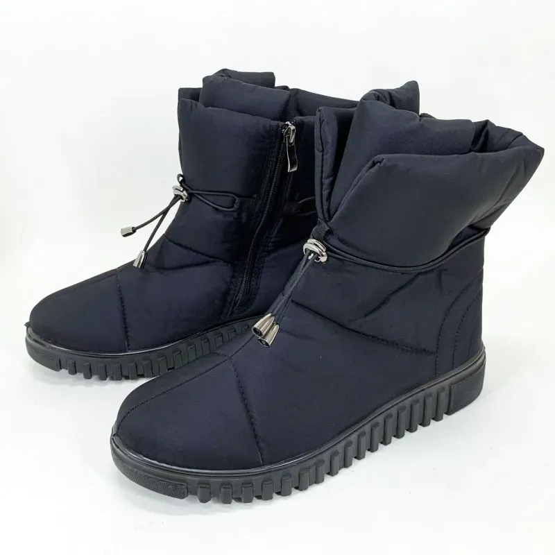 Женские утепленные ботинки черного цвета – это удачная комбинация удобства, актуального дизайна и функциональности. Верхняя часть выполнена из плотного текстиля с мягкой стеганной структурой, которая не только сохраняет тепло, но и придает стильный объем. Эластичные шнурки с фиксаторами позволяют регулировать посадку и придают современный вид.