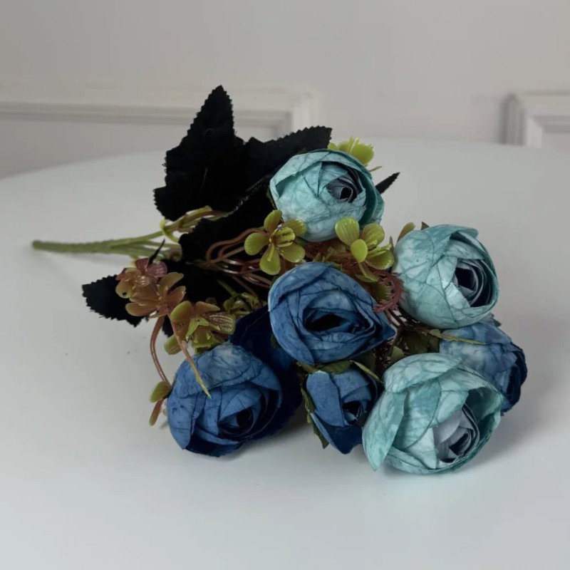 Искусственный букет Ранункулюсов – это изящное декоративное решение для создания уютной атмосферы в любом пространстве. Благодаря глубокому синему цвету лепестков и реалистичному виду композиция гармонично дополнит как домашний интерьер, так и оформление праздничных событий. В наборе два букета по 5 стеблей, в общей сложности 8 объемных цветков с миксом оттенков, которые выглядят естественно и стильно.
