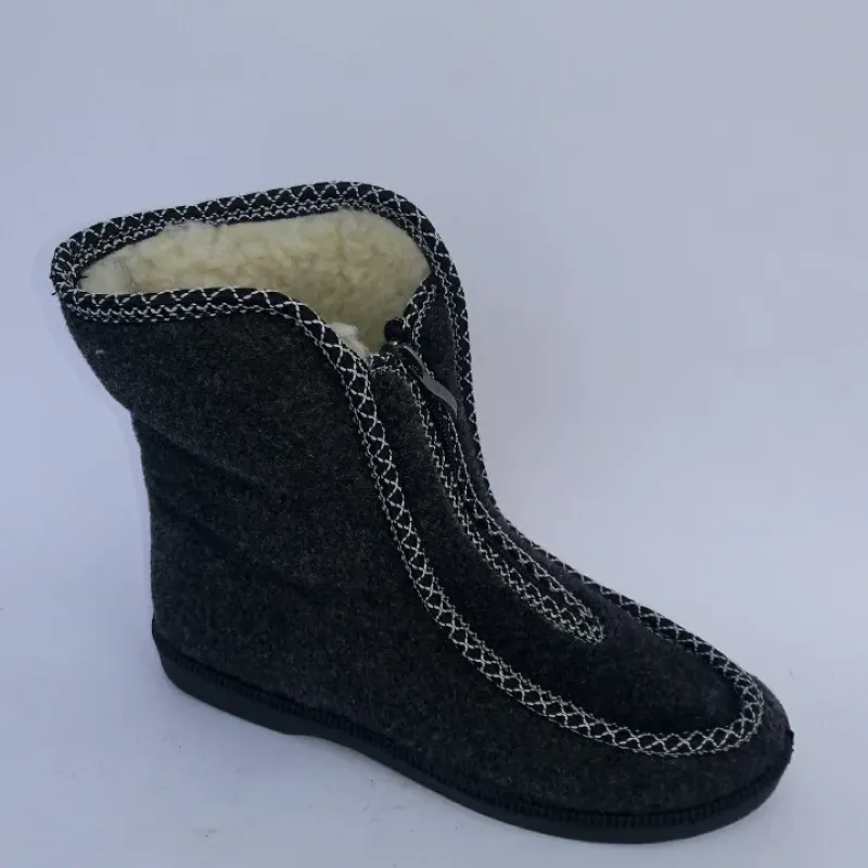 Дуже теплі та практичні короткі бурки (чуні) з повсті — ідеальний вибір для тих, хто шукає комфортне зимове взуття за доступною ціною. Ця модель чудово підходить для холодних приміщень, приватних будинків, а також для виходу на вулицю в суху морозну погоду. Верх виготовлений із щільного темно-сірого взуттєвого сукна (повсті), яке відмінно утримує тепло. Характерна особливість моделі — застібка-блискавка спереду. Таке розташування змійки дозволяє максимально легко взувати та знімати взуття, що особливо важливо для людей з високим підйомом або для літніх людей. Всередині чуні утеплені густим світлим штучним хутром, яке забезпечує м'якість та затишок. Акуратна біла декоративна строчка надає взуттю охайного вигляду. Підошва лита, гнучка та не ковзає. Характеристики: Сезон: Зима / Холодна осінь Матеріал верху: Повсть (щільний текстиль) Матеріал підкладки: Штучне хутро (овчина) Застібка: Блискавка спереду (зручно взувати) Підошва: ПВХ (зносостійка) Колір: Темно-сірий (графіт) Країна виробник: Україна Розміри в наявності: 37, 38, 39, 40, 41, 42