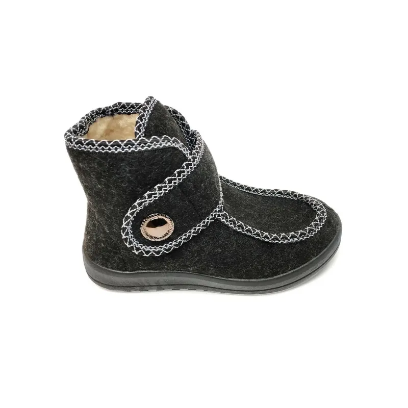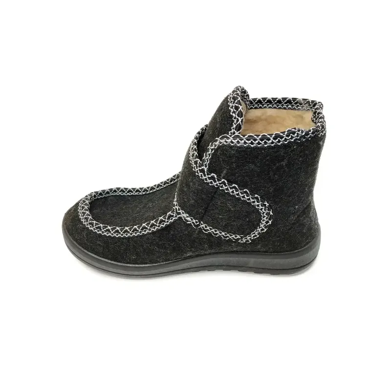 Зимові високі бурки (чуні) з регульованою застібкою — це порятунок для тих, кому важко підібрати взуття через високий підйом, широку кісточку або набряки. Ця модель поєднує в собі тепло, практичність та акуратний зовнішній вигляд. Верх виготовлений із щільного чорного взуттєвого сукна (повсті), яке надійно захищає від холоду. Головна особливість — широка застібка-липучка, яка дозволяє легко регулювати об'єм взуття по нозі. Збоку застібка прикрашена декоративним ґудзиком, що додає моделі елегантності. Всередині чоботи повністю утеплені густим штучним хутром (світла овчина). Підошва лита з ПВХ, має рифлений протектор, не ковзає та не тріскається на морозі. Висока халява забезпечує додаткове тепло для гомілковостопного суглоба. Характеристики: Сезон: Зима / Холодна осінь Матеріал верху: Сукно (щільна повсть) Матеріал підкладки: Штучне хутро (дуже тепле) Застібка: Липучка (регулювання повноти) Декор: Великий ґудзик збоку Колір: Чорний Підошва: ПВХ (лита, зносостійка) Розміри в наявності: 37, 38, 39, 40, 41, 42