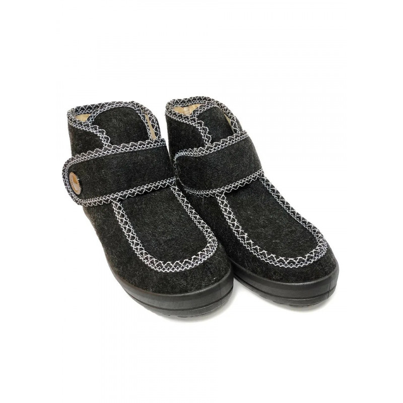 Зимові високі бурки (чуні) з регульованою застібкою — це порятунок для тих, кому важко підібрати взуття через високий підйом, широку кісточку або набряки. Ця модель поєднує в собі тепло, практичність та акуратний зовнішній вигляд. Верх виготовлений із щільного чорного взуттєвого сукна (повсті), яке надійно захищає від холоду. Головна особливість — широка застібка-липучка, яка дозволяє легко регулювати об'єм взуття по нозі. Збоку застібка прикрашена декоративним ґудзиком, що додає моделі елегантності. Всередині чоботи повністю утеплені густим штучним хутром (світла овчина). Підошва лита з ПВХ, має рифлений протектор, не ковзає та не тріскається на морозі. Висока халява забезпечує додаткове тепло для гомілковостопного суглоба. Характеристики: Сезон: Зима / Холодна осінь Матеріал верху: Сукно (щільна повсть) Матеріал підкладки: Штучне хутро (дуже тепле) Застібка: Липучка (регулювання повноти) Декор: Великий ґудзик збоку Колір: Чорний Підошва: ПВХ (лита, зносостійка) Розміри в наявності: 37, 38, 39, 40, 41, 42