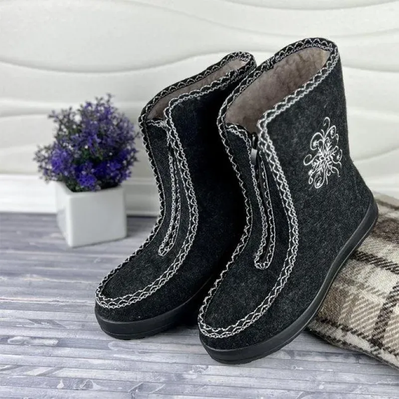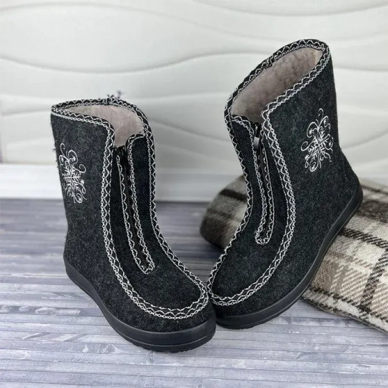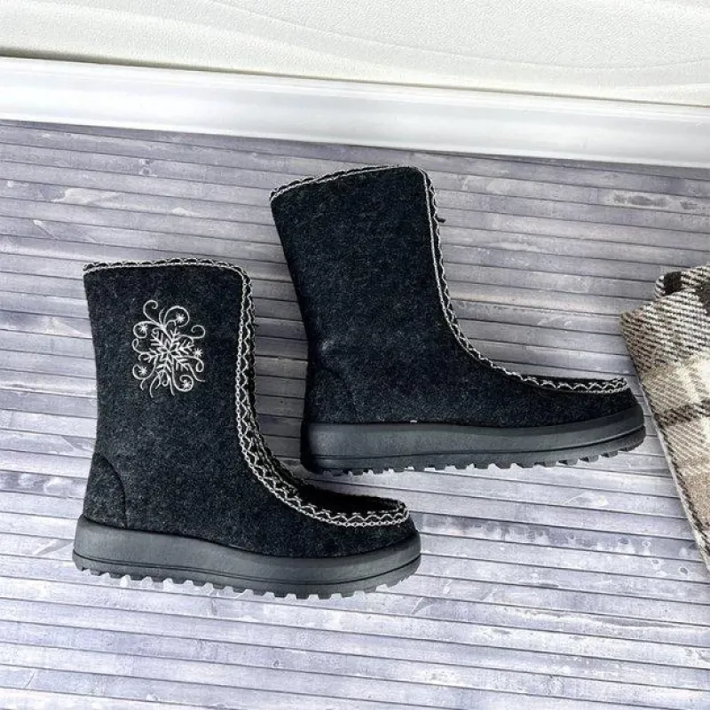 Затишні та теплі жіночі бурки (чуні) з декоративною вишивкою «Сніжинка» — це ідеальне поєднання комфорту та приємного зовнішнього вигляду. Ця модель стане незамінною для дому в холодну пору року, а також підійде для виходу у двір у суху погоду. Верх виготовлений із щільного темно-сірого повсті (войлоку), який чудово акумулює тепло. Головна особливість моделі — біла вишивка у вигляді сніжинки на халяві, що додає взуттю зимового настрою та робить його чудовим варіантом для подарунка. Всередині бурки утеплені густим штучним хутром, яке огортає ногу теплом. Зручна застібка-блискавка спереду дозволяє швидко та легко взуватися, не нахиляючись занадто низько, що особливо важливо для людей поважного віку. Підошва лита, надійна та не ковзає на гладких поверхнях. Характеристики: Сезон: Зима / Холодна осінь Матеріал верху: Повсть (текстиль) Матеріал підкладки: Штучне хутро (дуже тепле) Декор: Вишивка «Сніжинка», декоративний шов Застібка: Блискавка спереду Підошва: ПВХ (зносостійка) Країна виробник: Україна Розміри в наявності: 37, 38, 39, 40, 41
