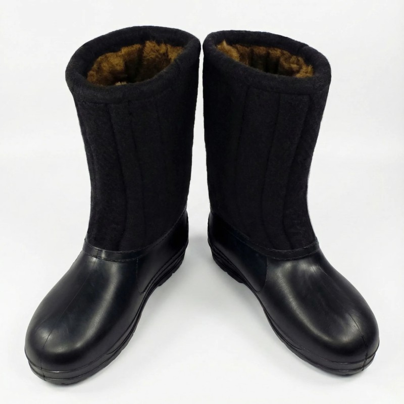 Натуральний повсть з овечої вовни створює унікальну терморегуляцію — ноги залишаються теплими навіть при -40°C, при цьому не потіють. Гумові калоші надійно захищають від вологи, снігу та бруду, а шита конструкція забезпечує довговічність на роки.