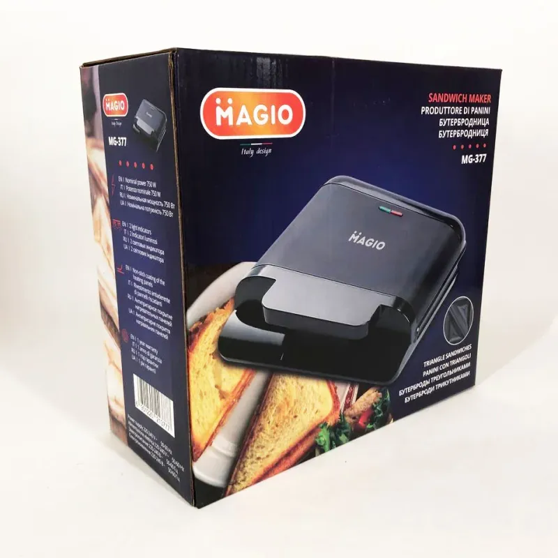 Бутербродница MG-377 обладает всеми необходимыми функциями для того, чтобы быстро приготовить вкусные и питательные сэндвичи. Одновременно в ней можно выпекать сразу по 4 сэндвича, края которых плотно спаиваются бортиками форм, надежно запирая начинку внутри. Корпус изготовлен из высококлассного термостойкого пластика красного цвета. Тип противня – поджаренный сэндвич в форме треугольников. Нагревательный элемент мощностью в 750 Вт обеспечит быстрое и равномерное нагревание двух рабочих поверхностей с антипригарным покрытием. Бутербродницы Magio очень удобны в обращении, сэндвичи не пригорают и легко извлекаются. Благодаря компактным размерам и фиксатору бутербродницу удобно хранить. На крышке имеются световые индикаторы питания и готовности к работе, что облегчает контролирование процесса приготовления.