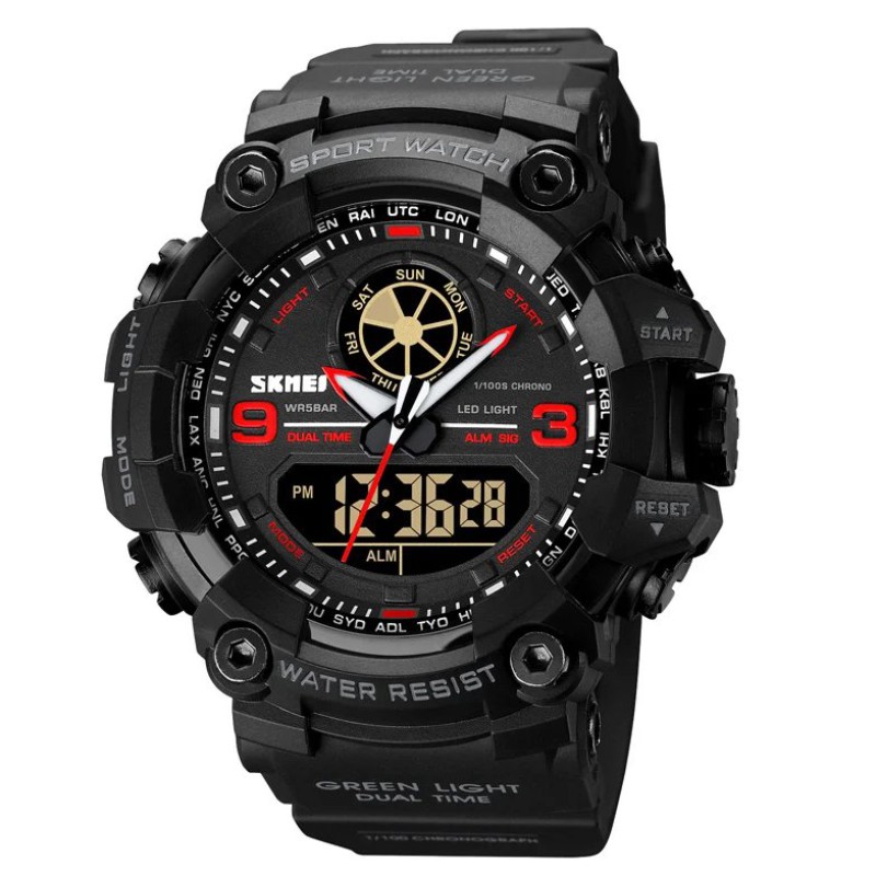 Модель оборудована расширенным функционалом: двойное время, будильник, секундомер, таймер, подсветка, дата, день недели и режим 12/24 часа. Водозащита 5ATM позволяет безопасно носить часы во время дождя, мытья рук или незначительных водных процедур. Благодаря крепкому полимерному корпусу и надежному ремешку, SKMEI 1818RD выдерживает интенсивную эксплуатацию.