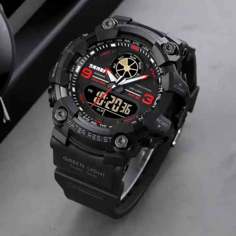 Часы SKMEI 1818RD — это выбор настоящих поклонников спортивного стиля с акцентом на функциональность и агрессивный дизайн. Модель привлекает контрастными красными элементами на циферблате, мощным корпусом и ярко выраженной графикой. Благодаря сочетанию аналогового и цифрового отображения эти часы прекрасно справляются с ролью практического инструмента на каждый день и стильного аксессуара.