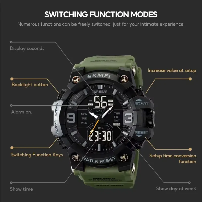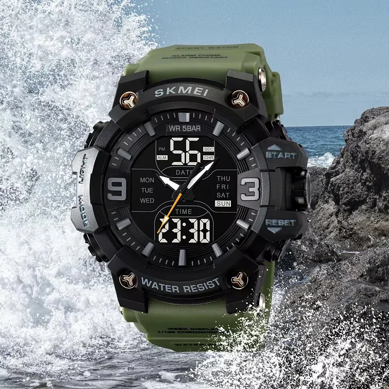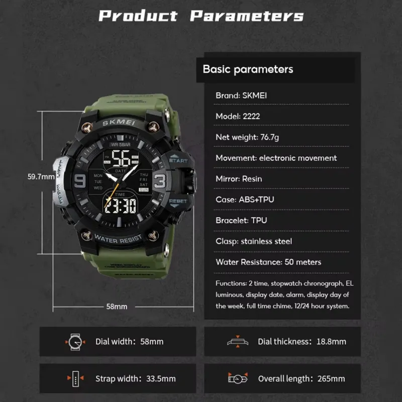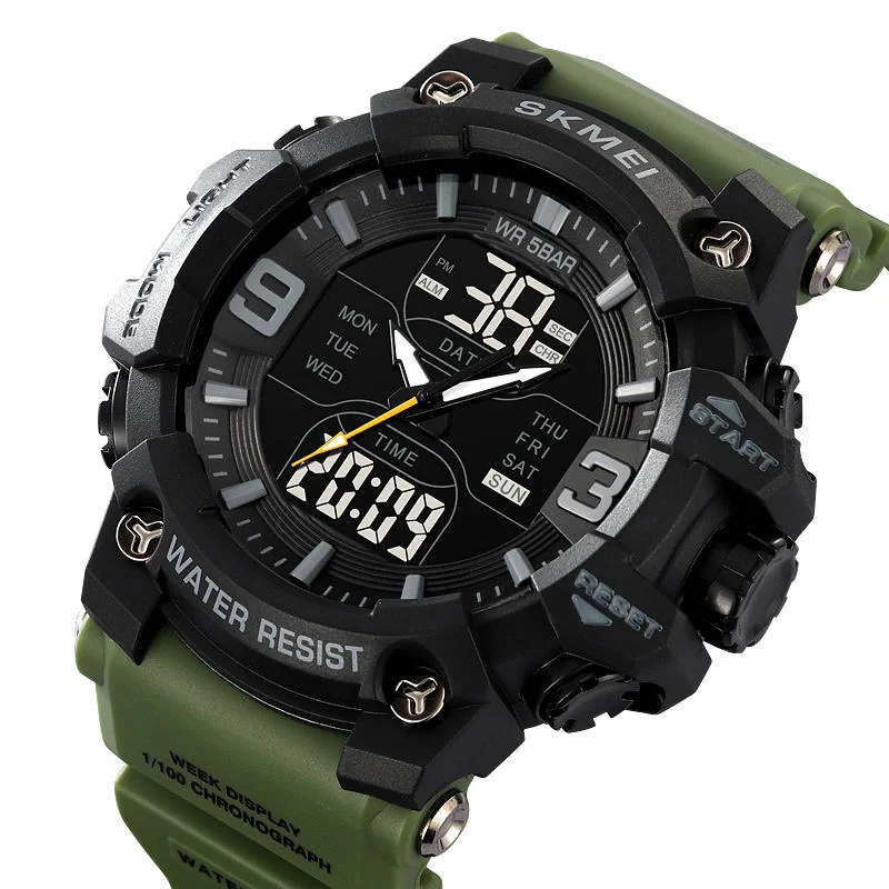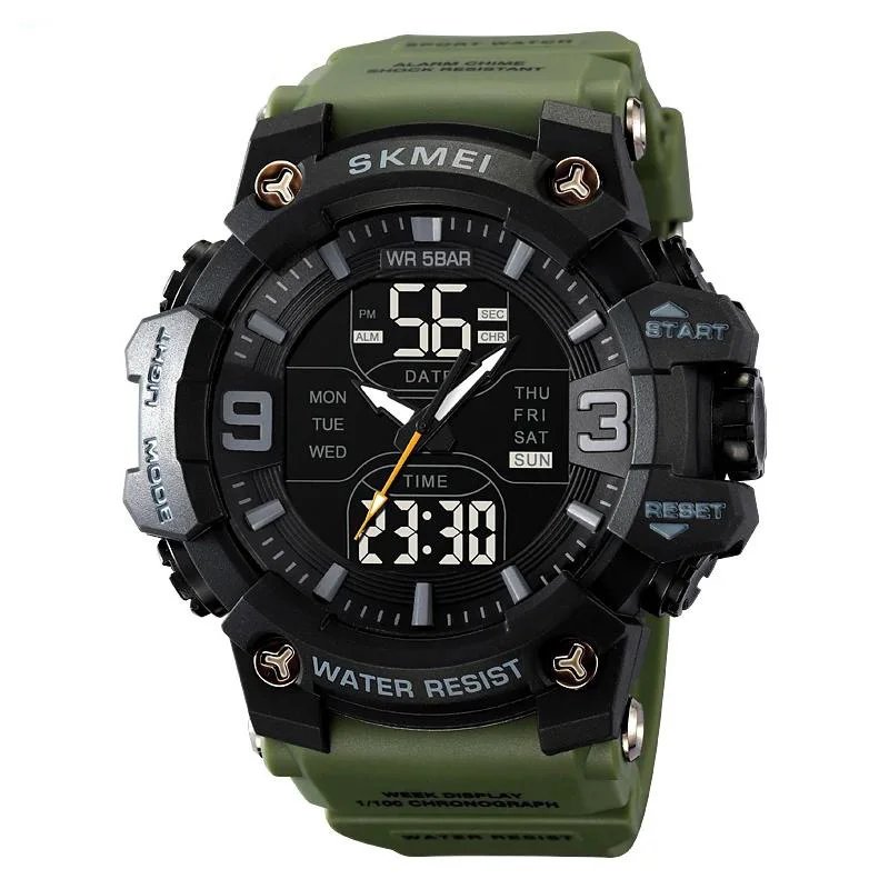 Времена SKMEI 2222AG — это идеальный выбор для тех, кто ищет сочетание агрессивного военного стиля и функциональности. Модель имеет массивный корпус с насыщенным чёрным циферблатом, дополненный цифровыми дисплеями и аналоговыми стрелками. Зеленый ремешок придает иногда характер и подчеркивает его тактический образ, идеально подходящий как для активного отдыха, так и для повседневной носки.