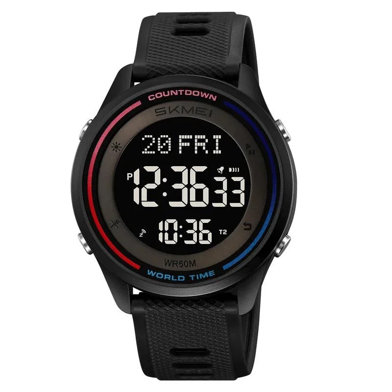 Часы SKMEI 2348BKBK созданы для тех, кто ценит простоту, функциональность и надежность в современном стиле. Его полностью чёрный корпус с лаконичным дизайном и акцентными красными и синими деталями на безели подчеркивает спортивный характер модели. Большой цифровой дисплей обеспечивает максимальное удобство считывания информации в любых условиях, включая активные тренировки или поездки.