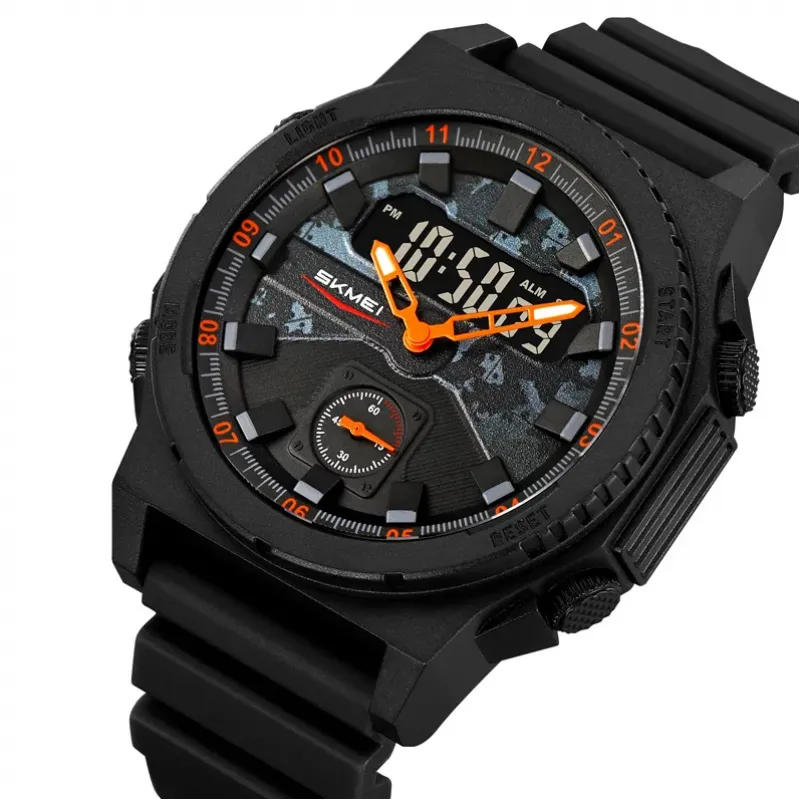 Часы SKMEI 2355BKOG — это идеальный выбор для тех, кто ценит яркий стиль и практичность. Его камуфляжный циферблат с насыщенными оранжевыми стрелками превосходно сочетается с черным корпусом и ремешком, создавая эффектный образ. Аналогово-цифровой механизм обеспечивает точность хода и удобство использования в любых условиях как в городе, так и на природе.