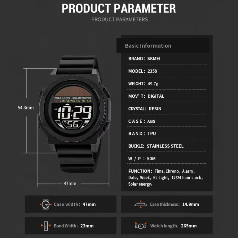 Часы SKMEI 2358BKBK — это сочетание минимализма и функциональности, выполненное в черном стиле. Модель разработана для ищущих выносливый и энергонезависимый аксессуар с точным электронным механизмом и современными возможностями. Благодаря встроенной солнечной панели, вы получаете длительное время автономной работы без необходимости частой замены батарей.