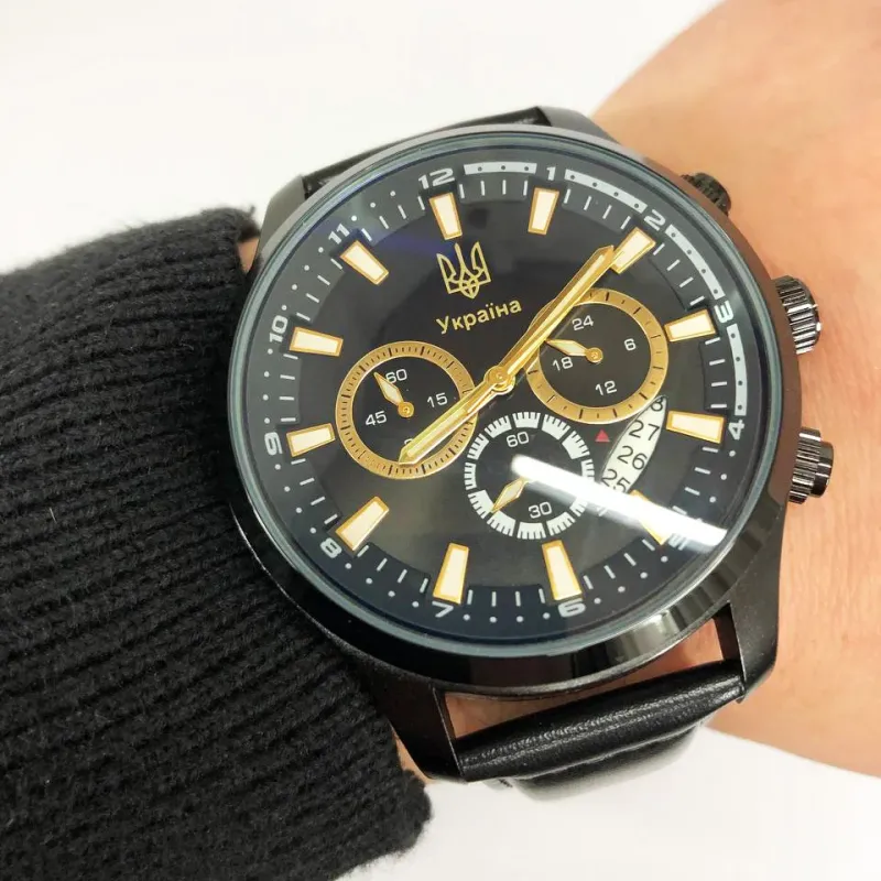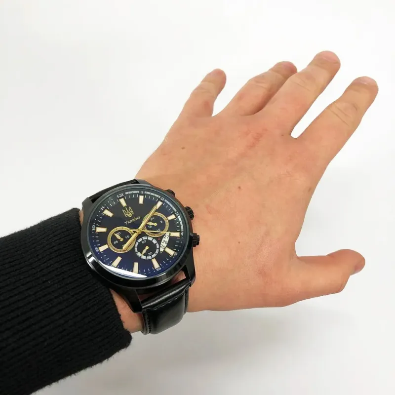 Часы SKMEI 4991/1994GD — это удачное сочетание патриотического стиля, классики и функциональности. Черный циферблат украшен золотистыми стрелками и маркерами, а также гербом Украины и надписью "Украина", придающей изделию выразительный национальный характер. Три дополнительных циферблата для хронографа и 24-часовой шкалы дополняют строгий и элегантный вид часов.