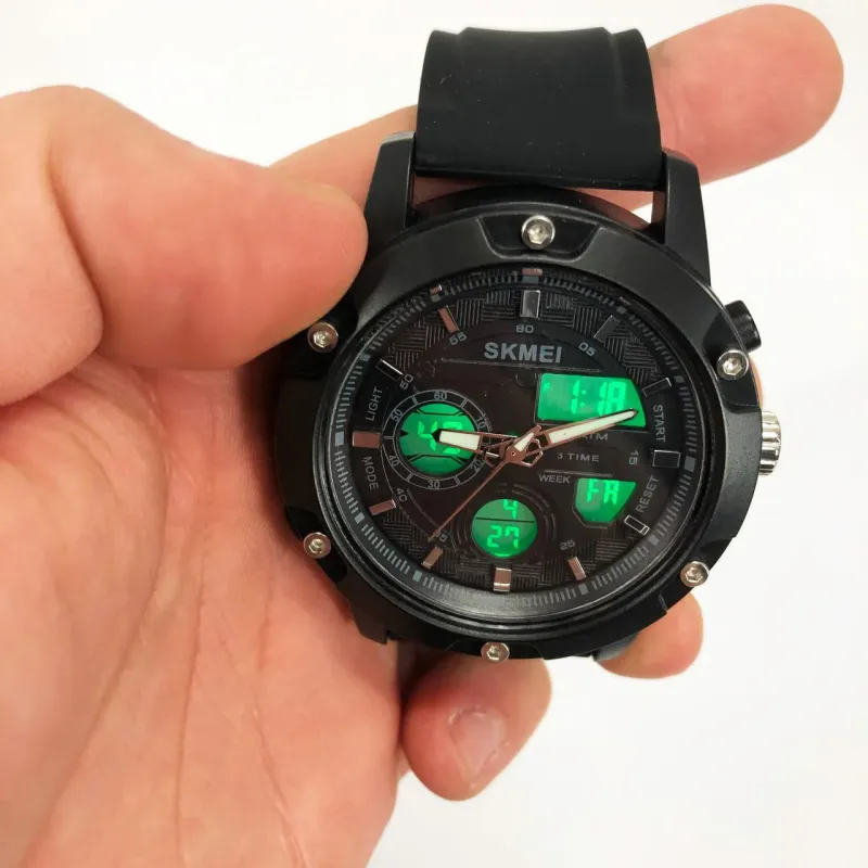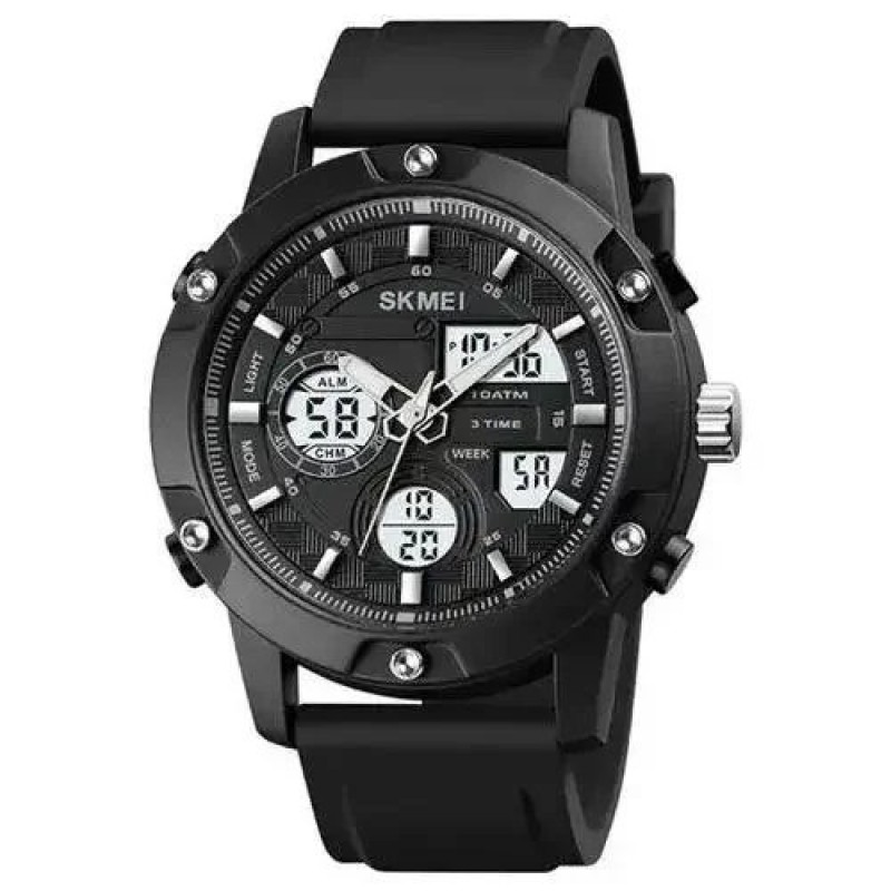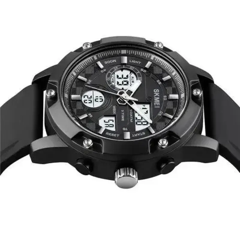 Модель предназначена для активного использования как в городе, так и во время путешествий. SKMEI 1757BKWT оснащен секундомером, будильником, таймером, тремя временными зонами и подсветкой. Благодаря водозащите 50 метров он не боится дождя или случайных брызг, а надежный ремешок из мягкого силикона обеспечивает комфортное прилегание к запястью.