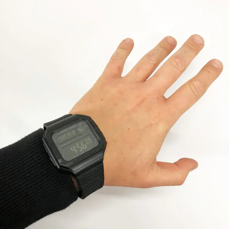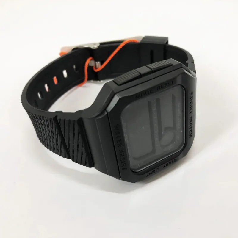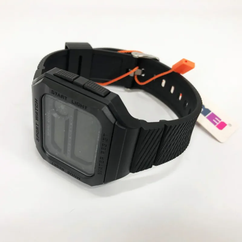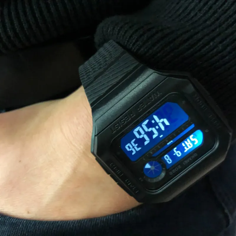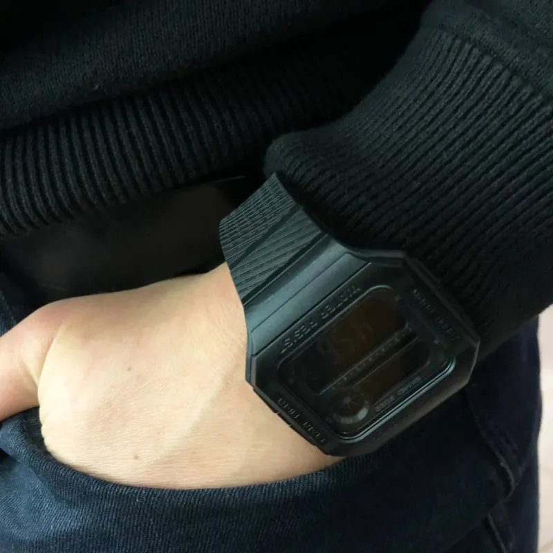 Модель отличается полностью черным минималистичным дизайном с шершавым ремешком, что придает стилю и повышает комфорт при ношении. Большой цифровой дисплей с подсветкой обеспечивает удобное чтение времени в любых условиях. Благодаря водонепроницаемости до 5 ATM часы не боятся дождя, душа или брызг воды.