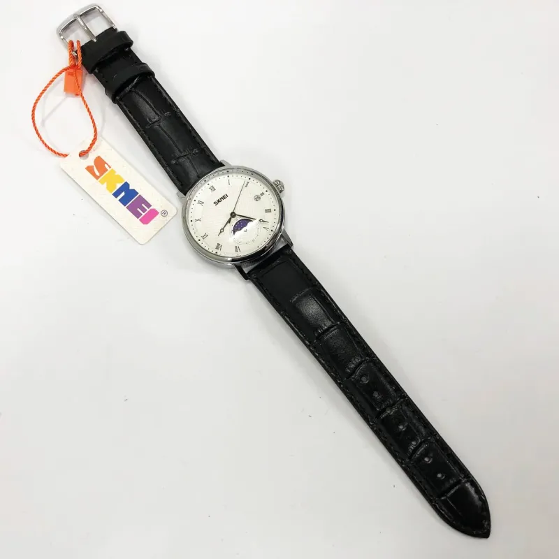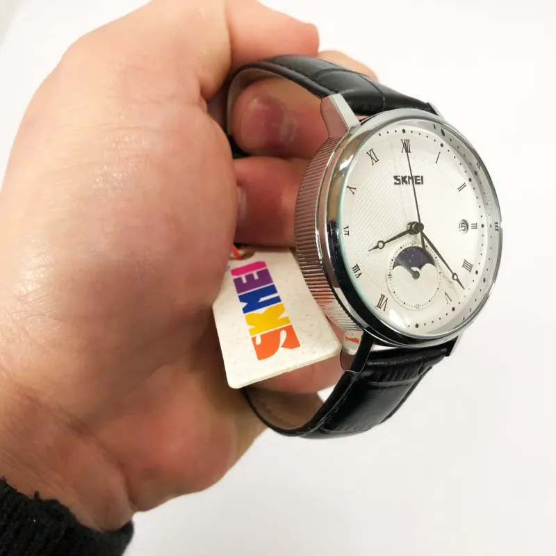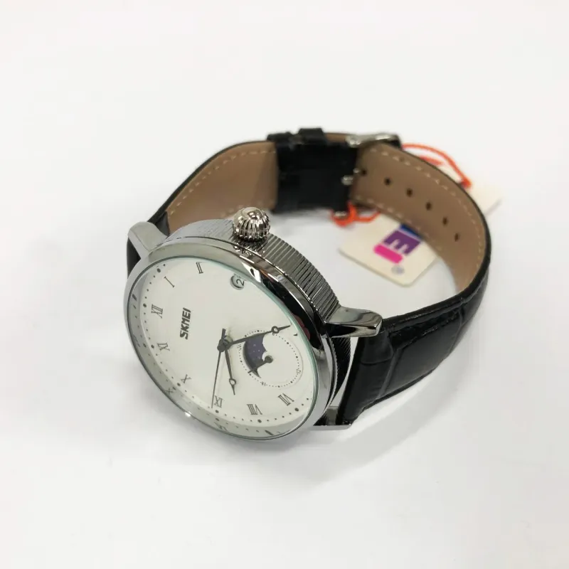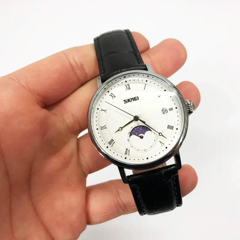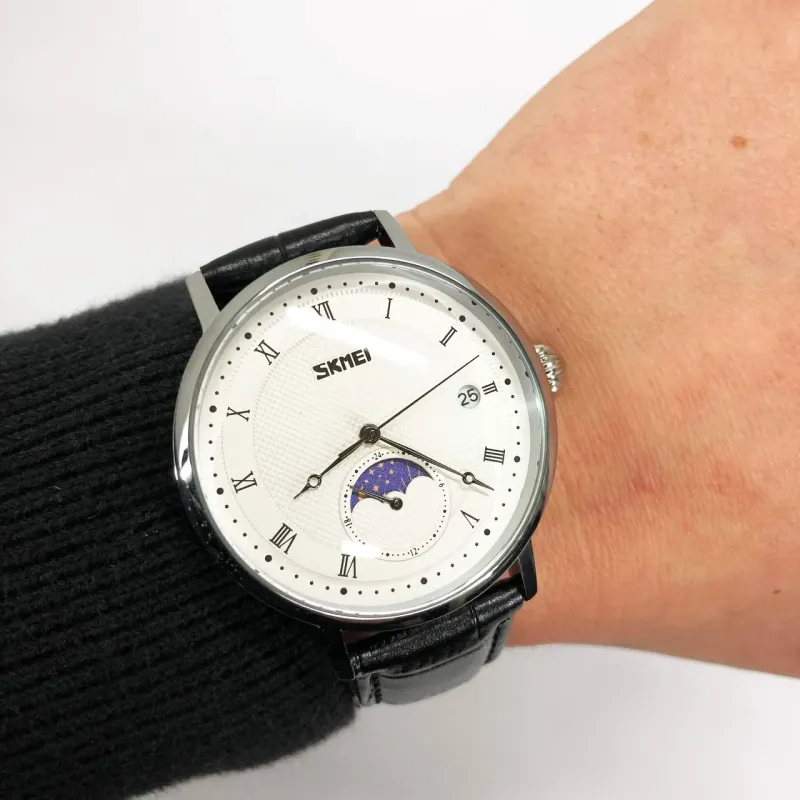 SKMEI 9308SIBK — это классические наручные часы, сочетающие в себе элегантный стиль и продуманную функциональность. Сдержанный серебристый корпус дополнен белым циферблатом с римскими цифрами, а также окошком даты и индикатором фаз луны – элементами, придающими изысканность и практичность. Модель отлично подойдет для деловых встреч, офисного стиля или торжественных событий.