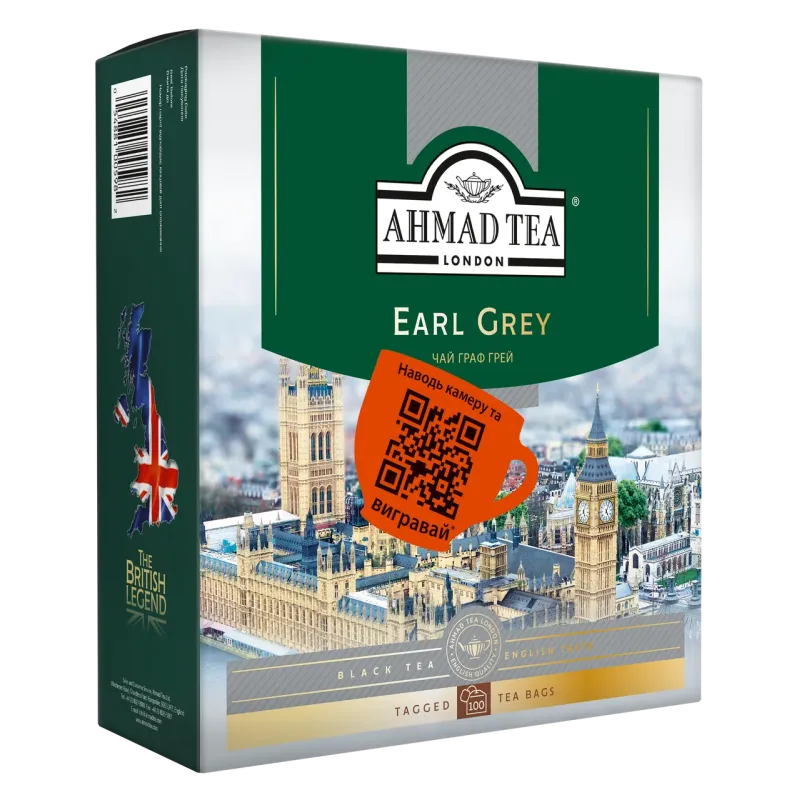 Чай чорний Ahmad Tea Earl Grey 100 пакетиків | Акція "British Legend", З бергамотом, Граф Грей