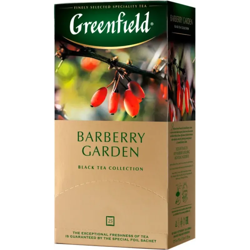 Greenfield Barberry Garden — це преміальний чорний чай з натуральним барбарисом та гібіскусом, який дарує неперевершений баланс терпкості та фруктової свіжості. 25 пакетиків для щоденної насолоди смаком, що запам'ятовується.