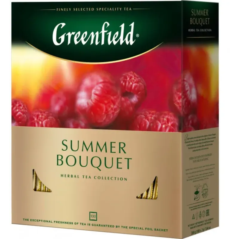 Greenfield Summer Bouquet — це ароматний трав'яний чай з малиною, каркаде та фруктовими нотками. 100 пакетиків натурального напою для щоденного насолодження смаком літа. Ідеальний вибір для тих, хто цінує користь та яскравий смак.