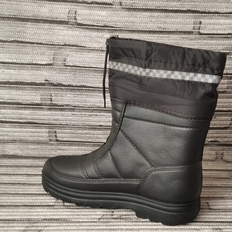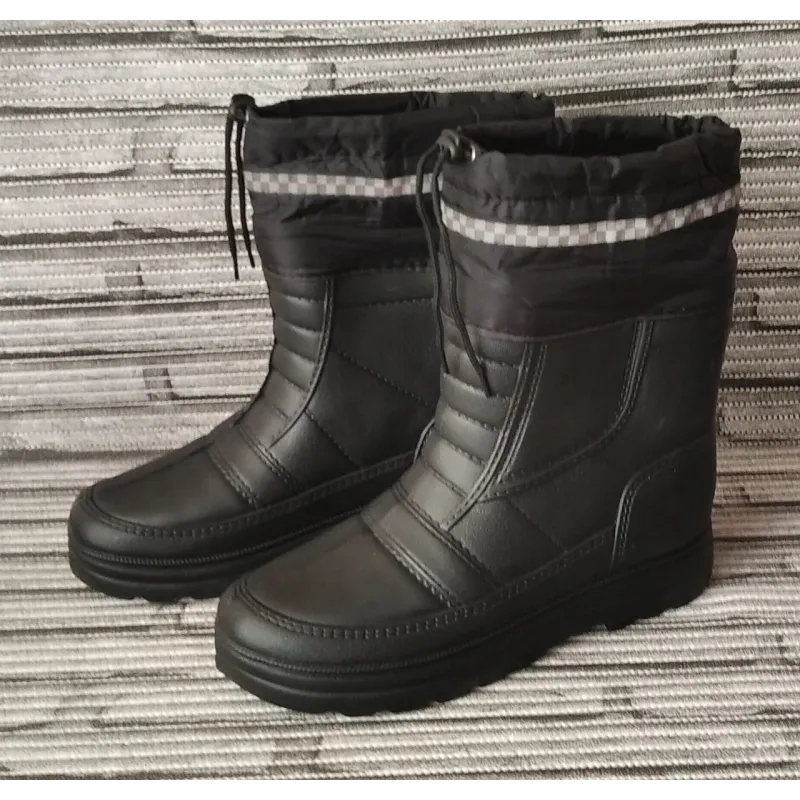 Зустрічайте зиму у всеозброєнні з цими надійними та теплими комбінованими чоботами! Це ідеальне рішення для холодної та мокрої погоди, коли важливо зберегти ноги в теплі та сухості. Модель поєднує в собі найкращі властивості сучасних матеріалів, забезпечуючи максимальний комфорт навіть у найнесприятливіших умовах. Нижня частина чобіт виготовлена з інноваційного матеріалу — піни ЕВА (EVA). Цей матеріал не тільки на 100% водонепроникний, але й надзвичайно легкий та має відмінні теплоізоляційні властивості, не пропускаючи холод від землі. Верхня частина виконана з міцного водовідштовхуючого текстилю з стьобаним візерунком, що додає моделі практичності та стильного вигляду. Всередині чоботи утеплені, що гарантує комфортну температуру для ваших ніг. Особливістю моделі є високий манжет на затяжці зверху. Він надійно фіксується на нозі, запобігаючи потраплянню снігу, вологи та холодного повітря всередину. Для вашої безпеки в темний час доби передбачена спеціальна світловідбиваюча стрічка. Масивна підошва з глибоким протектором забезпечує відмінне зчеплення зі слизькою поверхнею. Ці чоботи стануть вашим незамінним супутником для зимових прогулянок, роботи на вулиці або активного відпочинку. Характеристики: Матеріал низу: Піна ЕВА (EVA) (водонепроникний, легкий) Матеріал верху: Водовідштовхуючий текстиль Колір: Чорний (практичний) Сезон: Зима / Холодна осінь Особливості: Утеплені, манжет на затяжці для захисту від снігу, світловідбиваюча стрічка